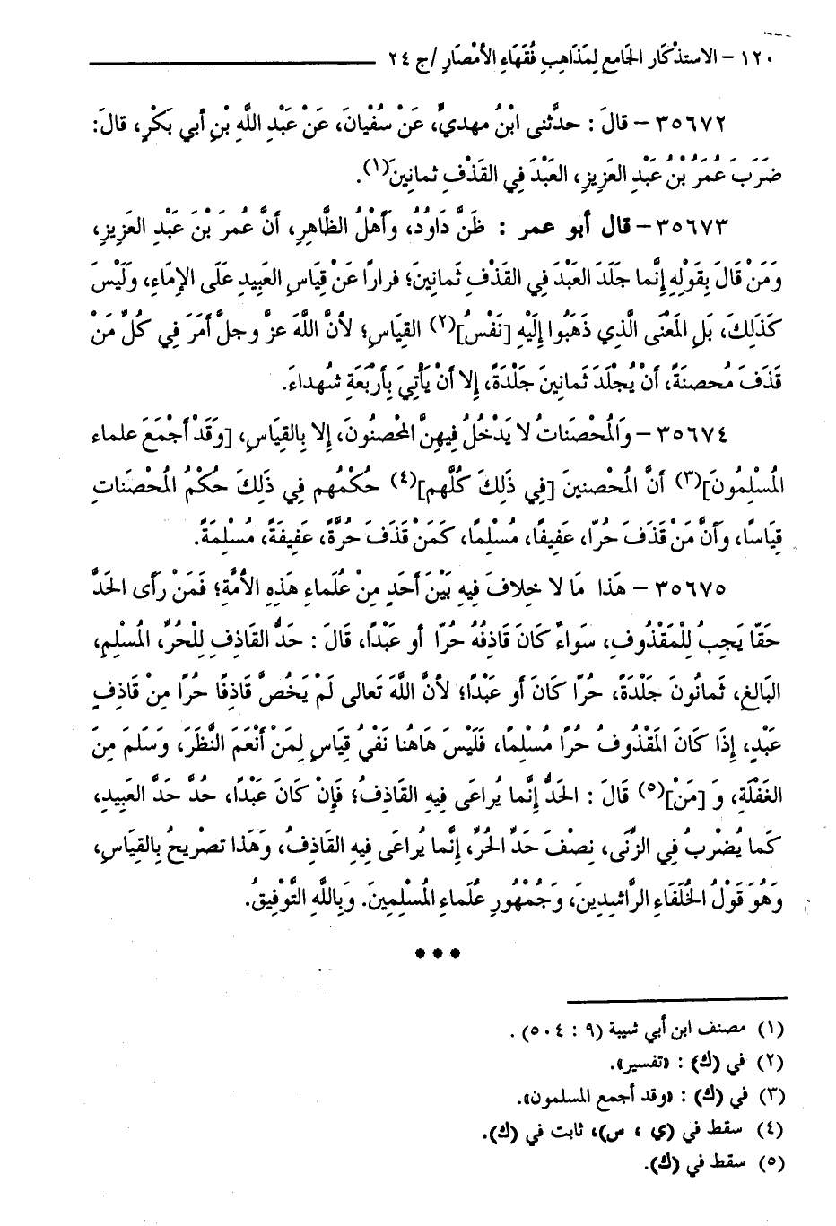 35673 - قَالَ أَبُو عُمَرَ: ظَنَّ دَاوُدُ، وَأَهِلُ الظَّاهِرِ أَنَّ عُمَرَ بْنَ عَبْدِ الْعَزِيزَ، وَمَنْ قَالَ بِقَوْلِهِ إِنَّمَا جَلَدَ الْعَبْدُ فِي الْقَذْفِ ثَمَانِينَ ؛ فِرَارًا عَنْ قِيَاسِ الْعَبِيدِ عَلَى الْإِمَاءِ، وَلَيْسَ كَذَلِكَ، بَلِ الْمَعْنَى الَّذِي ذَهَبُوا إِلَيْهِ نَفْسُ الْقِيَاسِ ؛ لِأَنَّ اللَّهَ عَزَّ وَجَلَّ أَمَرَ فِي كُلِّ مَنْ قَذَفَ مُحْصَنَةً أَنْ يُجْلَدَ ثَمَانِينَ جَلْدَةً، إِلَّا أَنْ يَأْتِيَ بِأَرْبَعَةِ شُهَدَاءَ.