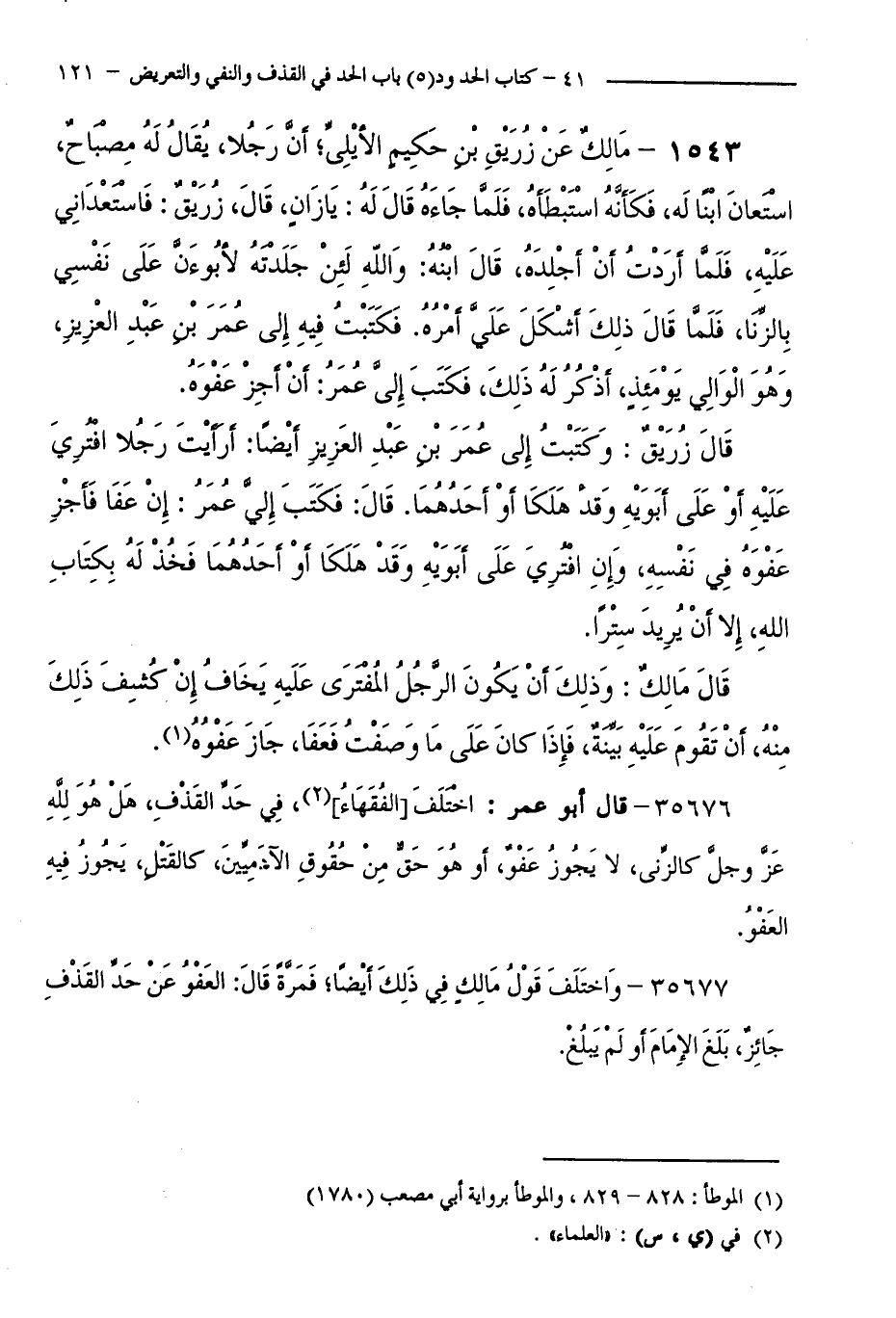 1543 - مَالِكٌ عَنْ زُرَيْقِ بْنِ حَكِيمٍ الْأَيْلِيِّ ؛ أَنَّ رَجُلًا يُقَالُ لَهُ مِصْبَاحٌ، اسْتَعَانَ ابْنًا لَهُ، فَكَأَنَّهُ اسْتَبْطَأَهُ، فَلَمَّا جَاءَهُ قَالَ لَهُ: يَا زَانٍ، قَالَ زُرَيْقٌ: فَاسْتَعْدَانِي عَلَيْهِ، فَلَمَّا أَرَدْتُ أَنْ أَجْلِدَهُ، قَالَ ابْنُهُ: وَاللَّهِ لَئِنْ جَلَدْتَهُ لَأَبُوءَنَّ عَلَى نَفْسِي بِالزِّنَا، فَلَمَّا قَالَ ذَلِكَ أَشْكَلَ عَلَيَّ أَمْرُهُ. فَكَتَبْتُ فِيهِ إِلَى عُمَرَ بْنِ عَبْدِ الْعَزِيزِ - وَهُوَ الْوَالِي يَوْمَئِذٍ - أَذْكُرُ لَهُ ذَلِكَ، فَكَتَبَ إِلَيَّ عُمَرُ: أَنْ أَجِزْ عَفْوَهُ.