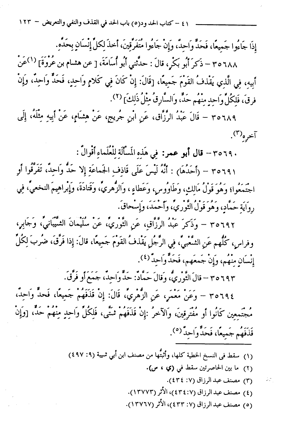 35694 - وَعَنْ مَعْمَرٍ، عَنِ الزُّهْرِيِّ، قَالَ: إِنْ قَذَفَهُمْ جَمِيعًا فَحَدٌّ وَاحِدٌ، مُجْتَمِعِينَ كَانُوا أَوْ مُفْتَرِقِينَ، وَالْآخَرُ: إِنْ قَذَفَهُمْ شَتَّى فَلِكُلِّ وَاحِدٍ مِنْهُمْ حَدٌّ، وَإِنْ قَذْفَهُمْ جَمِيعًا فَحَدٌّ وَاحِدٌ.