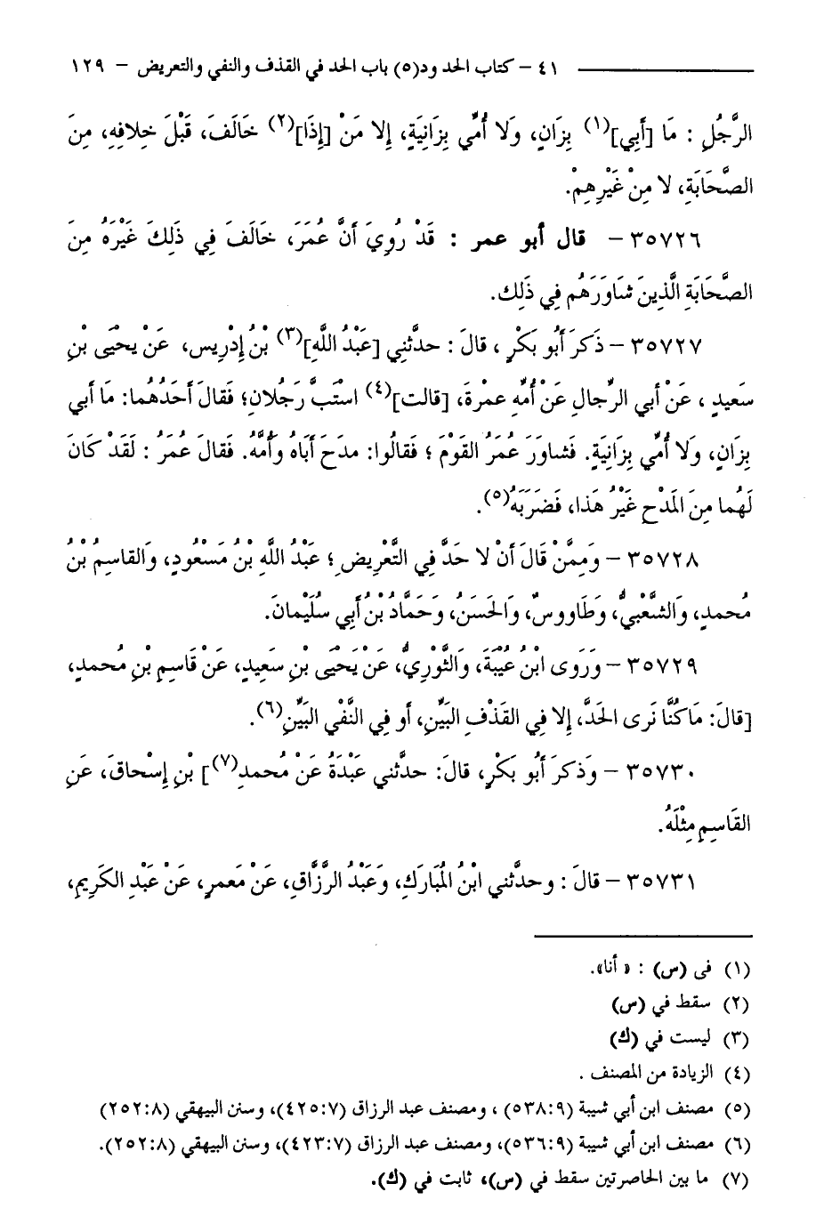 35728 - وَمِمَّنْ قَالَ أَنْ لَا حَدَّ فِي التَّعْرِيضِ: عَبْدُ اللَّهِ بْنُ مَسْعُودٍ، وَالْقَاسِمُ بْنُ مُحَمَّدٍ وَالشَّعْبِيُّ، وَطَاوُسٌ، وَالْحَسَنُ، وَحَمَّادُ بْنُ أَبِي سُلَيْمَانَ.