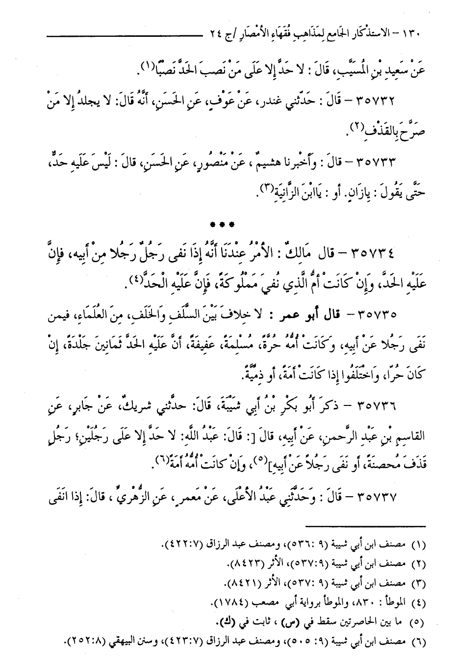 35734 - قَالَ مَالِكٌ: الْأَمْرُ عِنْدَنَا أَنَّهُ إِذَا نَفَى رَجُلٌ رَجُلًا مِنْ أَبِيهِ، فَإِنَّ عَلَيْهِ الْحَدَّ، وَإِنْ كَانَتْ أَمُّ الَّذِي نُفِيَ مَمْلُوكَةً، فَإِنَّ عَلَيْهِ الْحَدَّ.