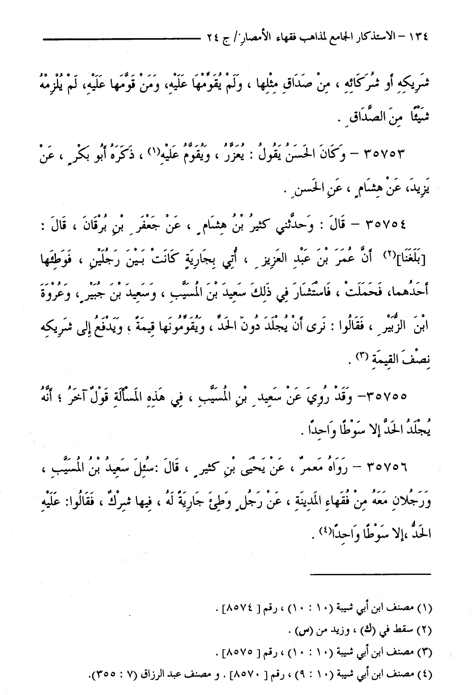 35756 - وَرَوَاهُ مَعْمَرٌ، عَنْ يَحْيَى بْنِ كَثِيرٍ، قَالَ: سُئِلَ سَعِيدُ بْنُ الْمُسَيَّبِ، وَرَجُلَانِ مَعَهُ مِنْ فُقَهَاءِ الْمَدِينَةِ، عَنْ رَجُلٍ وَطِئَ جَارِيَةً لَهُ فِيهَا شِرْكٌ، فَقَالُوا: عَلَيْهِ الْحَدُّ إِلَّا سَوْطًا وَاحِدًا.