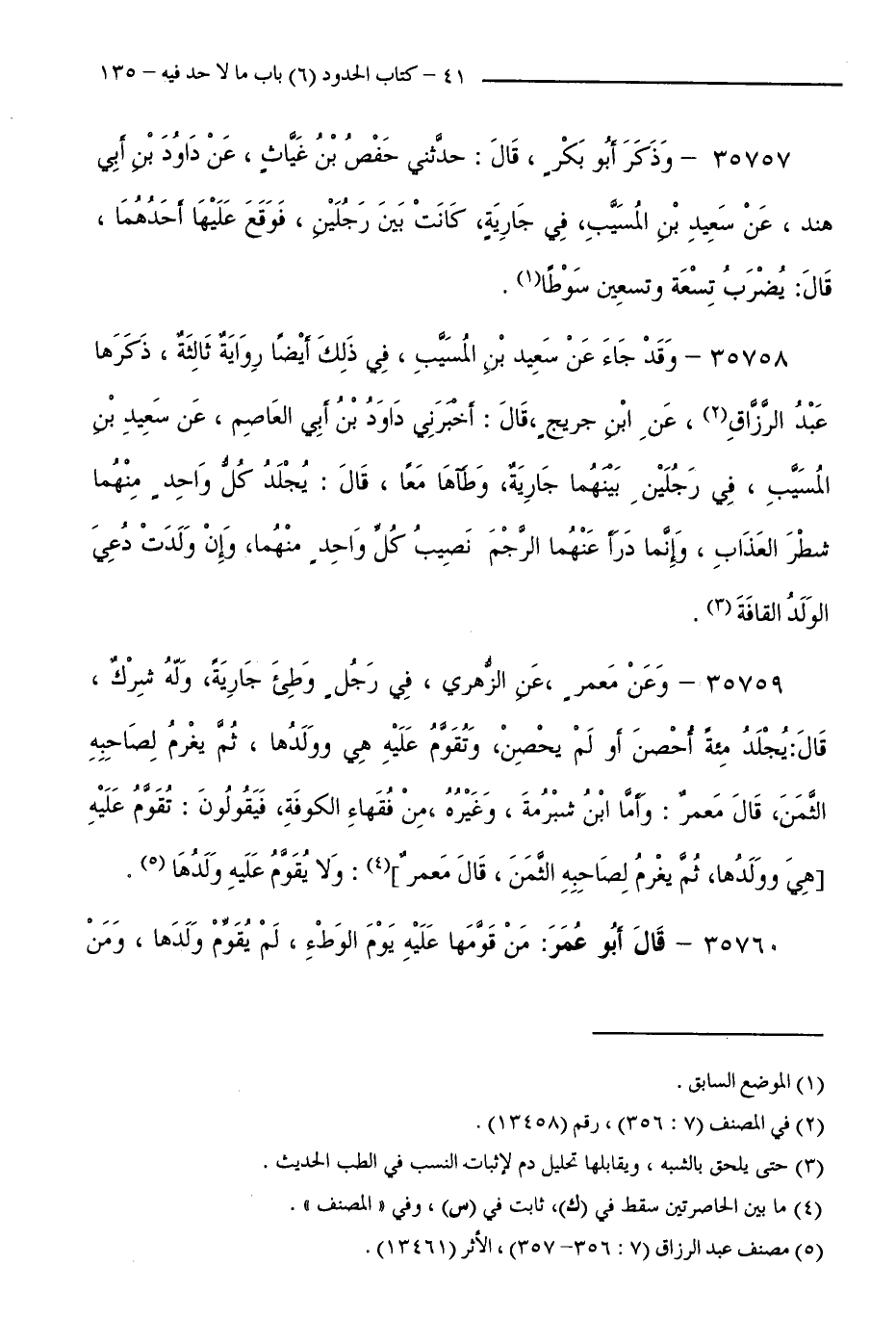 35758 - وَقَدْ جَاءَ عَنْ سَعِيدِ بْنِ الْمُسَيَّبِ، وَفِي ذَلِكَ أَيْضًا رِوَايَةٌ ثَالِثَةٌ، ذَكَرَهَا عَبْدُ الرَّزَّاقِ، عَنِ ابْنِ جُرَيْجٍ، قَالَ: أَخْبَرَنِي دَاوُدُ بْنُ أَبِي الْعَاصِمِ، عَنْ سَعِيدِ بْنِ الْمُسَيَّبِ، فِي رَجُلَيْنِ بَيْنَهُمَا جَارِيَةٌ، وَطِئَاهَا مَعًا، قَالَ: يُجْلَدُ كُلُّ وَاحِدٍ مِنْهُمَا شَطْرَ الْعَذَابِ، وَإِنَّمَا دَرَأَ عَنْهُمَا الرَّجْمَ نَصِيبُ كَلِّ وَاحِدٍ مِنْهُمَا، وَإِنْ وَلَدَتْ دُعِيَ لِلْوَلَدِ الْقَافَةُ.