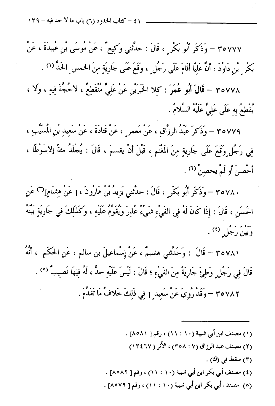 35777 - وَذَكَرَ أَبُو بَكْرٍ، قَالَ حَدَّثَنِي وَكِيعٌ، عَنْ مُوسَى بْنِ عُبَيْدَةَ، عَنْ بَكْرِ بْنِ دَاوُدَ، أَنَّ عَلِيًّا أَقَامَ عَلَى رَجُلٍ وَقَعَ عَلَى جَارِيَةٍ مِنَ الْخُمُسِ الْحَدَّ.