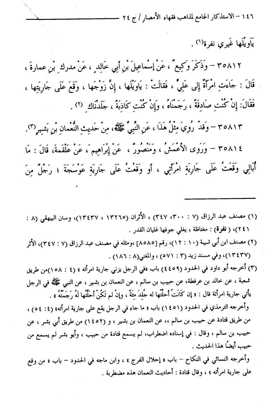 35814 - وَرَوَى الْأَعْمَشُ، وَمَنْصُورٌ، عَنْ إِبْرَاهِيمَ، عَنْ عَلْقَمَةَ، قَالَ: مَا أُبَالِي وَقَعْتُ عَلَى جَارِيَةِ امْرَأَتِي، أَوْ وَقَعْتُ عَلَى جَارِيَةِ عَوْسَجَةَ ؛ رَجُلٍ مِنَ