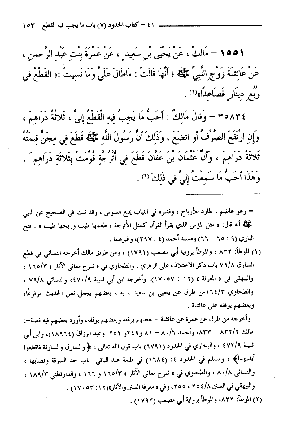 35834 - وَقَالَ مَالِكٌ: أَحَبُّ مَا يَجِبُ فِيهِ الْقَطْعُ إِلَيَّ، ثَلَاثَةُ دَرَاهِمَ، وَإِنِ ارْتَفَعَ الصَّرْفُ أَوِ اتَّضَعَ، وَذَلِكَ أَنَّ رَسُولَ اللَّهِ صَلَّى اللَّهُ عَلَيْهِ وَسَلَّمَ قَطَعَ مِجَنٍّ قِيمَتُهُ ثَلَاثَةُ دَرَاهِمَ وَأَنَّ عُثْمَانَ بْنَ عَفَّانَ قَطَعَ فِي أُتْرُجَّةٍ قُوِّمَتْ بِثَلَاثَةِ دَرَاهِمَ. وَهَذَا أَحَبُّ مَا سَمِعْتُ إِلَيَّ فِي ذَلِكَ.