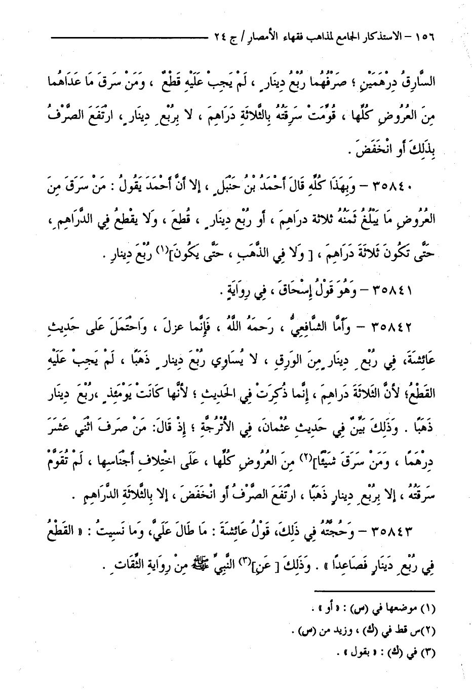 35840 - وَبِهَذَا كُلِّهِ قَالَ أَحْمَدُ بْنُ حَنْبَلٍ، إِلَّا أَنَّ أَحْمَدَ يَقُولُ: مَنْ سَرَقَ مِنَ الْعُرُوضِ مَا يَبْلُغُ ثَمَنُهُ ثَلَاثَةَ دَرَاهِمَ، أَوْ رُبُعَ دِينَارٍ قُطِعَ، وَلَا يُقْطَعُ فِي الدَّرَاهِمِ، حَتَّى تَكُونَ ثَلَاثَةَ دَرَاهِمَ، وَلَا فِي الذَّهَبِ، حَتَّى يَكُونَ رُبُعَ دِينَارٍ.