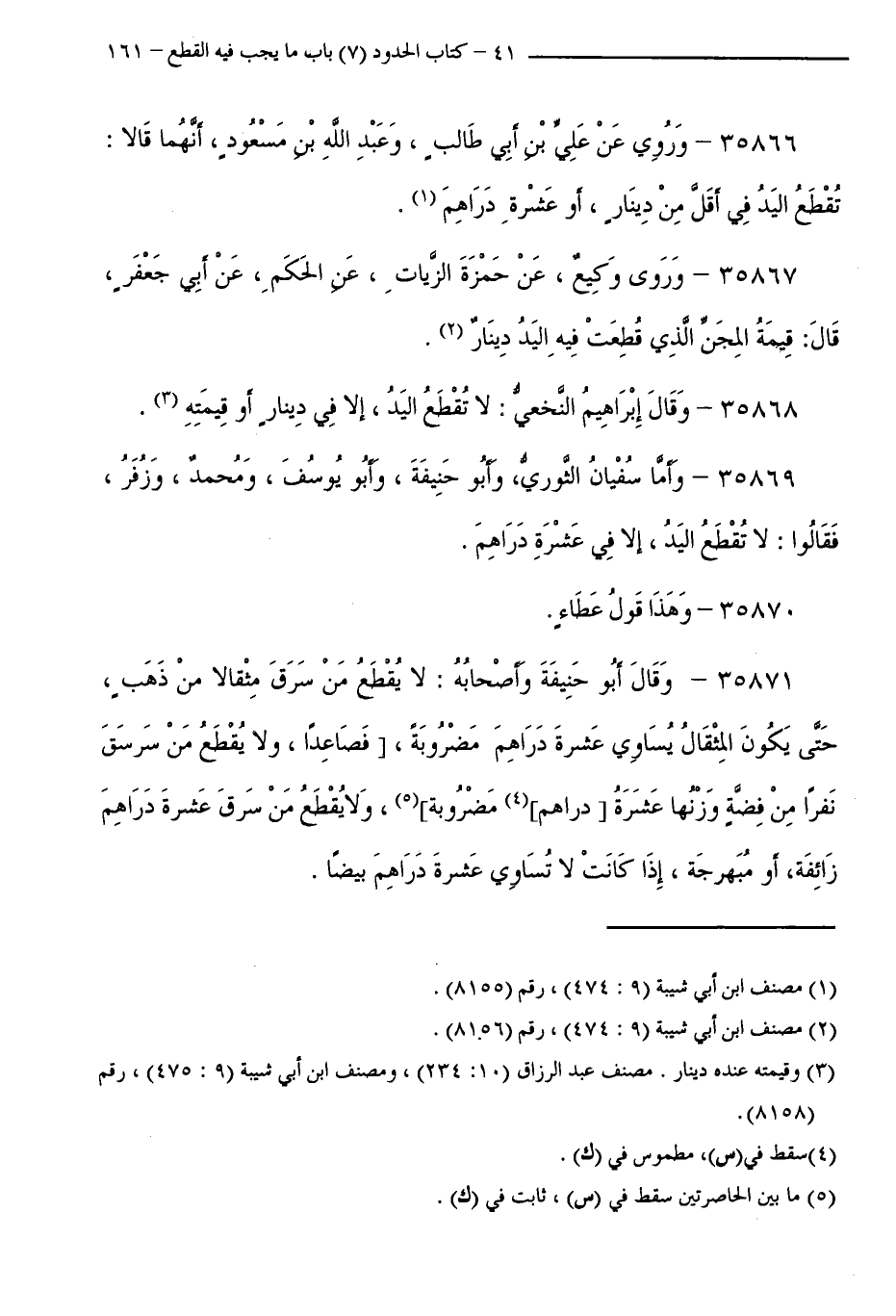 35869 - وَأَمَّا سُفْيَانُ الثَّوْرِيُّ، وَأَبُو حَنِيفَةَ، وَأَبُو يُوسُفَ، وَمُحَمَّدٌ، وَزُفَرُ فَقَالُوا: لَا تُقْطَعُ الْيَدُ إِلَّا فِي عَشَرَةِ دَرَاهِمَ.