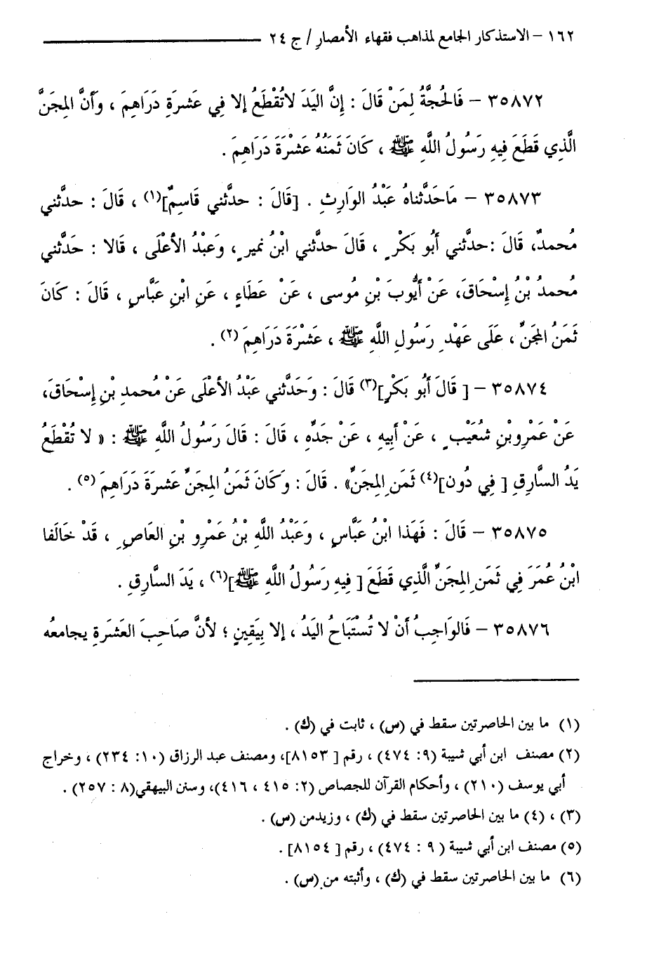35872 - فَالْحُجَّةُ لِمَنْ قَالَ: إِنَّ الْيَدَ لَا تُقْطَعُ إِلَّا فِي عَشَرَةِ دَرَاهِمَ، وَأَنَّ الْمِجَنَّ الَّذِي قَطَعَ فِيهِ رَسُولُ اللَّهِ صَلَّى اللَّهُ عَلَيْهِ وَسَلَّمَ كَانَ ثَمَنُهُ عَشَرَةَ دَرَاهِمَ.