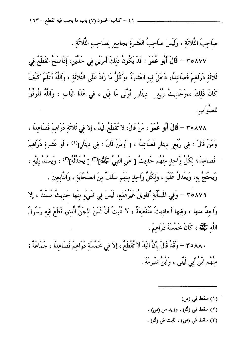 35880 - وَقَدْ قَالَ بِأَنَّ الْيَدَ لَا تُقْطَعُ إِلَّا فِي خَمْسَةِ دَرَاهِمَ فَصَاعِدًا جَمَاعَةٌ ؛ مِنْهُمُ ابْنُ أَبِي لَيْلَى، وَابْنُ شُبْرُمَةَ.
