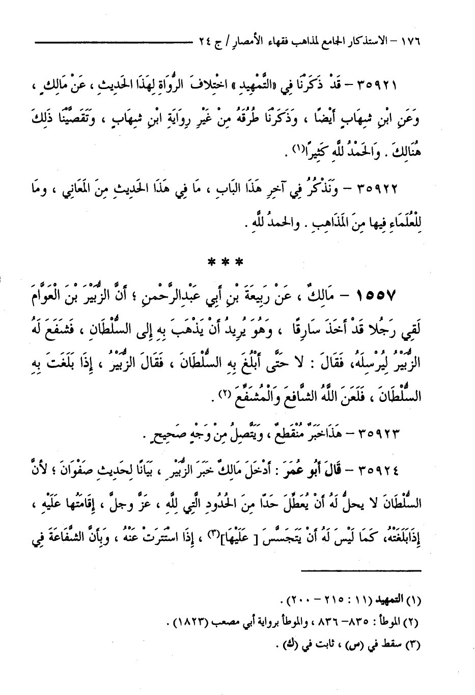 1557 - مَالِكٌ، عَنْ رَبِيعَةَ بْنِ أَبِي عَبْدِ الرَّحْمَنِ ؛ أَنَّ الزُّبَيْرَ بْنَ الْعَوَّامِ لَقِيَ رَجُلًا قَدْ أَخَذَ سَارِقًا، وَهُوَ يُرِيدُ أَنْ يَذْهَبَ بِهِ إِلَى السُّلْطَانِ، فَشَفَعَ لَهُ الزُّبَيْرُ لِيُرْسِلَهُ، فَقَالَ: لَا حَتَّى أَبْلُغَ بِهِ السُّلْطَانَ. فَقَالَ الزُّبَيْرُ: إِذَا بَلَغْتَ بِهِ السُّلْطَانَ فَلَعَنَ اللَّهُ الشَّافِعَ وَالْمُشَفِّعَ.