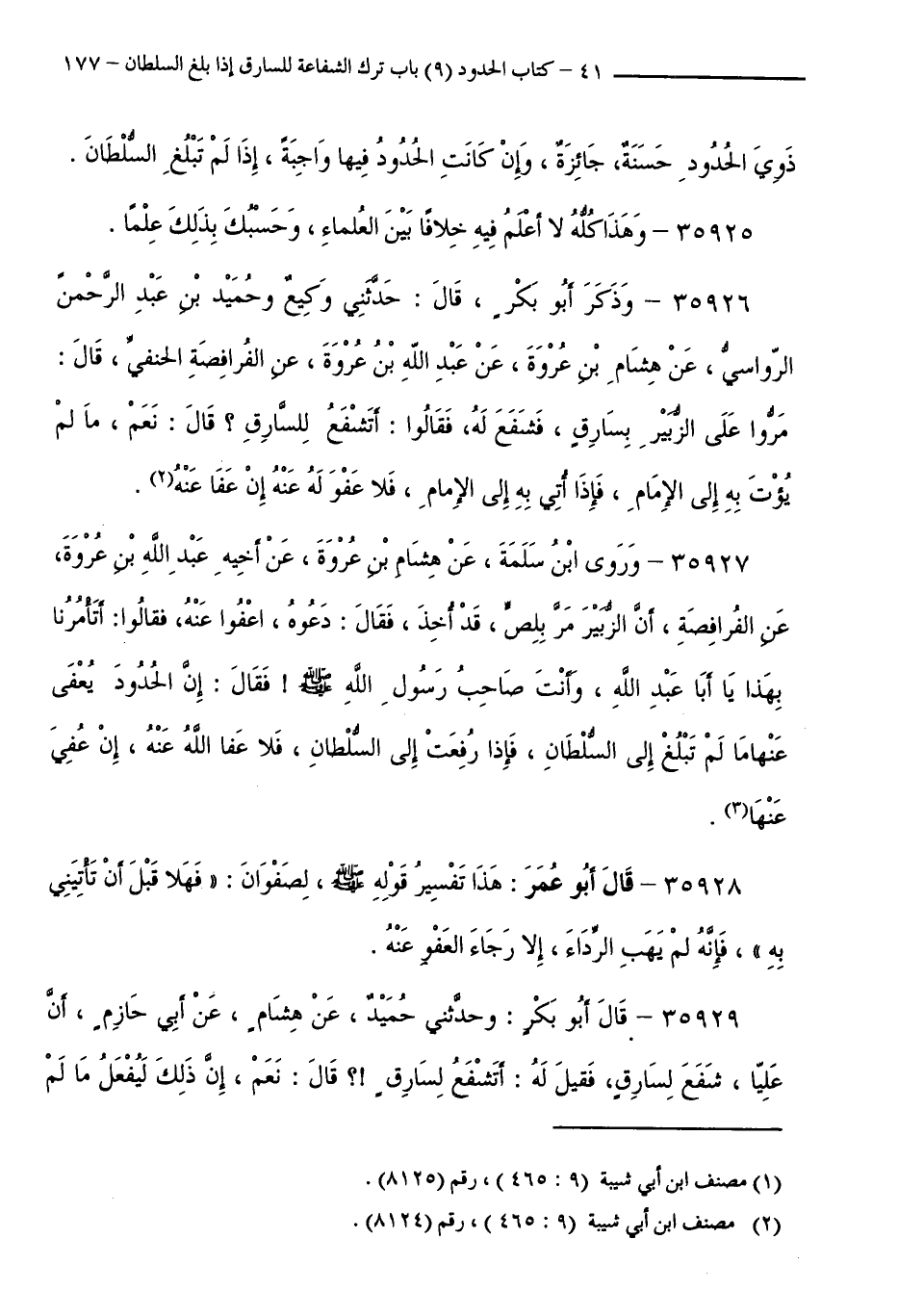 35926 - وَذَكَرَ أَبُو بَكْرٍ، قَالَ: حَدَّثَنِي وَكِيعٌ وَحُمَيْدُ بْنُ عَبْدِ الرَّحْمَنِ الرُّؤَاسِيُّ، عَنْ هِشَامِ بْنِ عُرْوَةَ، عَنْ عَبْدِ اللَّهِ بْنِ عُرْوَةَ، عَنِ الْفُرَافِصَةِ الْحَنَفِيِّ، قَالَ: مَرُّوا عَلَى الزُّبَيْرِ بِسَارِقٍ فَشَفَعَ لَهُ. فَقَالُوا: أَتَشْفَعُ لِلسَّارِقِ ؟ قَالَ: نَعَمْ، مَا لَمْ يُؤْتَ بِهِ إِلَى الْإِمَامِ. فَإِذَا أُتِيَ بِهِ إِلَى الْإِمَامِ فَلَا عَفْوَ لَهُ عَنْهُ إِنْ عَفَا عَنْهُ.