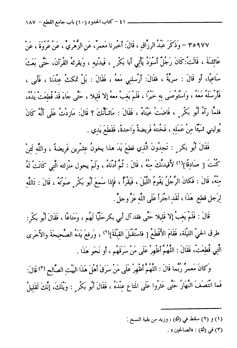 35977 - وَذَكَرَ عَبْدُ الرَّزَّاقِ، قَالَ: أَخْبَرَنَا مَعْمَرٌ، عَنِ الزُّهْرِيِّ، عَنْ عُرْوَةَ، عَنْ عَائِشَةَ، قَالَتْ: كَانَ رَجُلٌ أَسْوَدُ يَأْتِي أَبَا بَكْرٍ فَيُدْنِيهِ، وَيُقْرِئُهُ الْقُرْآنَ. حَتَّى بَعَثَ سَاعِيًا، أَوْ قَالَ: سِرِّيَّةً، فَقَالَ: أَرْسِلْنِي مَعَهُ، فَقَالَ: بَلْ تَمْكُثُ عِنْدَنَا، فَأَبَى، فَأَرْسَلَهُ مَعَهُ، وَاسْتَوْصَى بِهِ خَيْرًا، فَلَمْ يَغِبْ مَعَهُ إِلَّا قَلِيلًا، حَتَّى جَاءَ قَدْ قُطِعَتْ يَدُهُ، فَلَمَّا رَآهُ أَبُو بَكْرٍ فَاضَتْ عَيْنَاهُ، فَقَالَ: مَا شَأْنُكَ ؟ قَالَ: مَا زِدْتُ عَلَى أَنَّهُ كَانَ يُوَلِّينِي شَيْئًا مِنْ عَمَلِهِ، فَخُنْتُهُ فَرِيضَةً وَاحِدَةً فَقَطَعَ يَدِي.