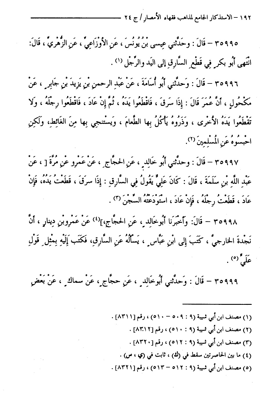 35995 - قَالَ: وَحَدَّثَنِي عِيسَى بْنُ يُونُسَ، عَنِ الْأَوْزَاعِيِّ، عَنِ الزُّهْرِيِّ، قَالَ: انْتَهَى أَبُو بَكْرٍ فِي قَطْعِ السَّارِقِ إِلَى الْيَدِ وَالرِّجْلِ.