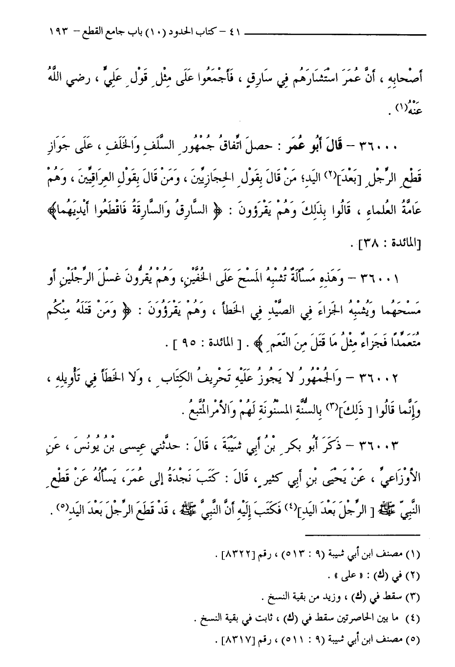 36003 - ذَكَرَ أَبُو بَكْرِ بْنُ أَبِي شَيْبَةَ، قَالَ: حَدَّثَنِي عِيسَى بْنُ يُونُسَ، عَنِ الْأَوْزَاعِيِّ، عَنْ يَحْيَى بْنِ أَبِي كَثِيرٍ، قَالَ:كَتَبَ نَجْدَةُ إِلَى عُمَرَ يَسْأَلُهُ عَنْ قَطْعِ النَّبِيِّ صَلَّى اللَّهُ عَلَيْهِ وَسَلَّمَ الرِّجْلَ بَعْدَ الْيَدِ. فَكَتَبَ إِلَيْهِ أَنَّ النَّبِيَّ صَلَّى اللَّهُ عَلَيْهِ وَسَلَّمَ قَدْ قَطَعَ الرِّجْلَ بَعْدَ الْيَدِ.