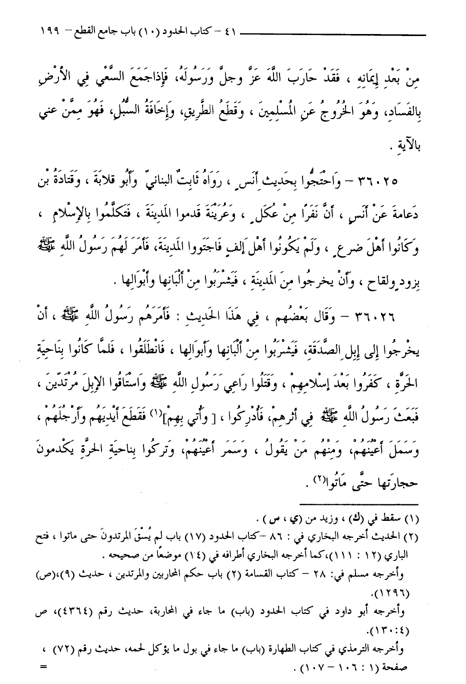 36026 - وَقَالَ بَعْضُهُمْ، فِي هَذَا الْحَدِيثِ:فَأَمَرَهُمْ رَسُولُ اللَّهِ صَلَّى اللَّهُ عَلَيْهِ وَسَلَّمَ أَنْ يَخْرُجُوا إِلَى إِبِلِ الصَّدَقَةِ، فَيَشْرَبُوا مِنْ أَلْبَانِهَا وَأَبْوَالِهَا فَانْطَلَقُوا، فَلَمَّا كَانُوا بِنَاحِيَةِ الْحَرَّةِ كَفَرُوا بَعْدَ إِسْلَامِهِمْ، وَقَتَلُوا رَاعِيَ رَسُولِ اللَّهِ صَلَّى اللَّهُ عَلَيْهِ وَسَلَّمَ وَاسْتَاقُوا الْإِبِلَ مُرْتَدِّينَ، فَبَعَثَ رَسُولُ اللَّهِ صَلَّى اللَّهُ عَلَيْهِ وَسَلَّمَ فِي أَثَرِهِمْ فَأُدْرِكُوا، وَأُتِيَ بِهِمْ فَقَطَعَ أَيْدِيَهُمْ وَأَرْجُلَهُمْ، وَسَمَلَ أَعْيُنَهُمْ، وَمِنْهُمْ مَنْ يَقُولُ، وَسَمَرَ أَعْيُنَهُمْ، وَتُرِكُوا بِنَاحِيَةِ الْحَرَّةِ يَكْدِمُونَ حِجَارَتَهَا حَتَّى مَاتُوا.