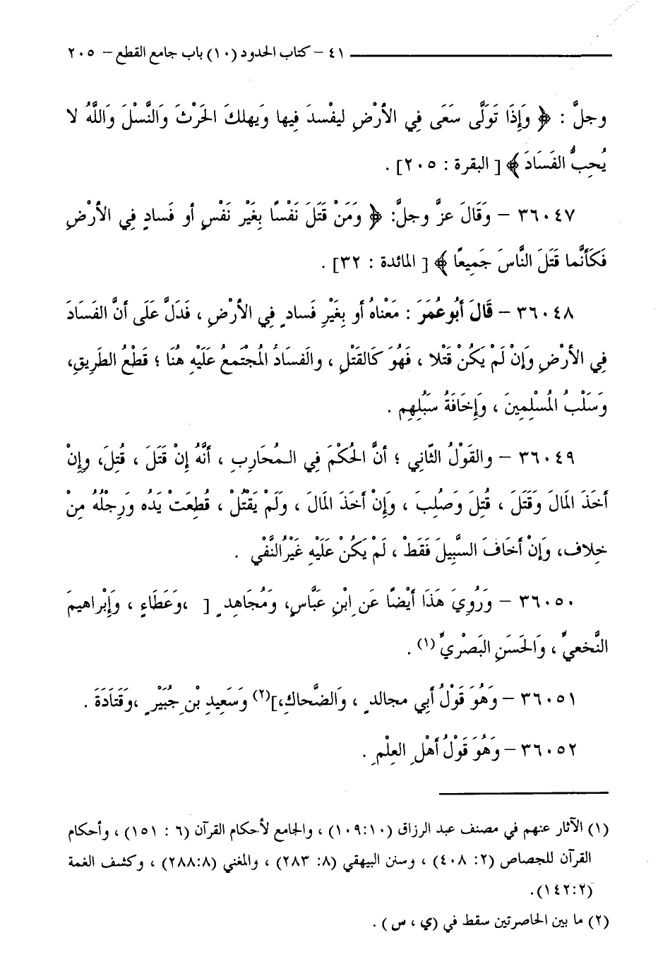 36048 - قَالَ أَبُو عُمَرَ: مَعْنَاهُ أَوْ بِغَيْرِ فَسَادٍ فِي الْأَرْضِ، فَدَلَّ عَلَى أَنَّ الْفَسَادَ فِي الْأَرْضِ وَإِنْ لَمْ يَكُنْ قَتْلًا، فَهُوَ كَالْقَتْلِ، وَالْفَسَادُ الْمُجْتَمَعُ عَلَيْهِ هُنَا قَطْعُ الطَّرِيقِ، وَسَلْبُ الْمُسْلِمِينَ، وَإِخَافَةُ سُبُلِهِمْ.