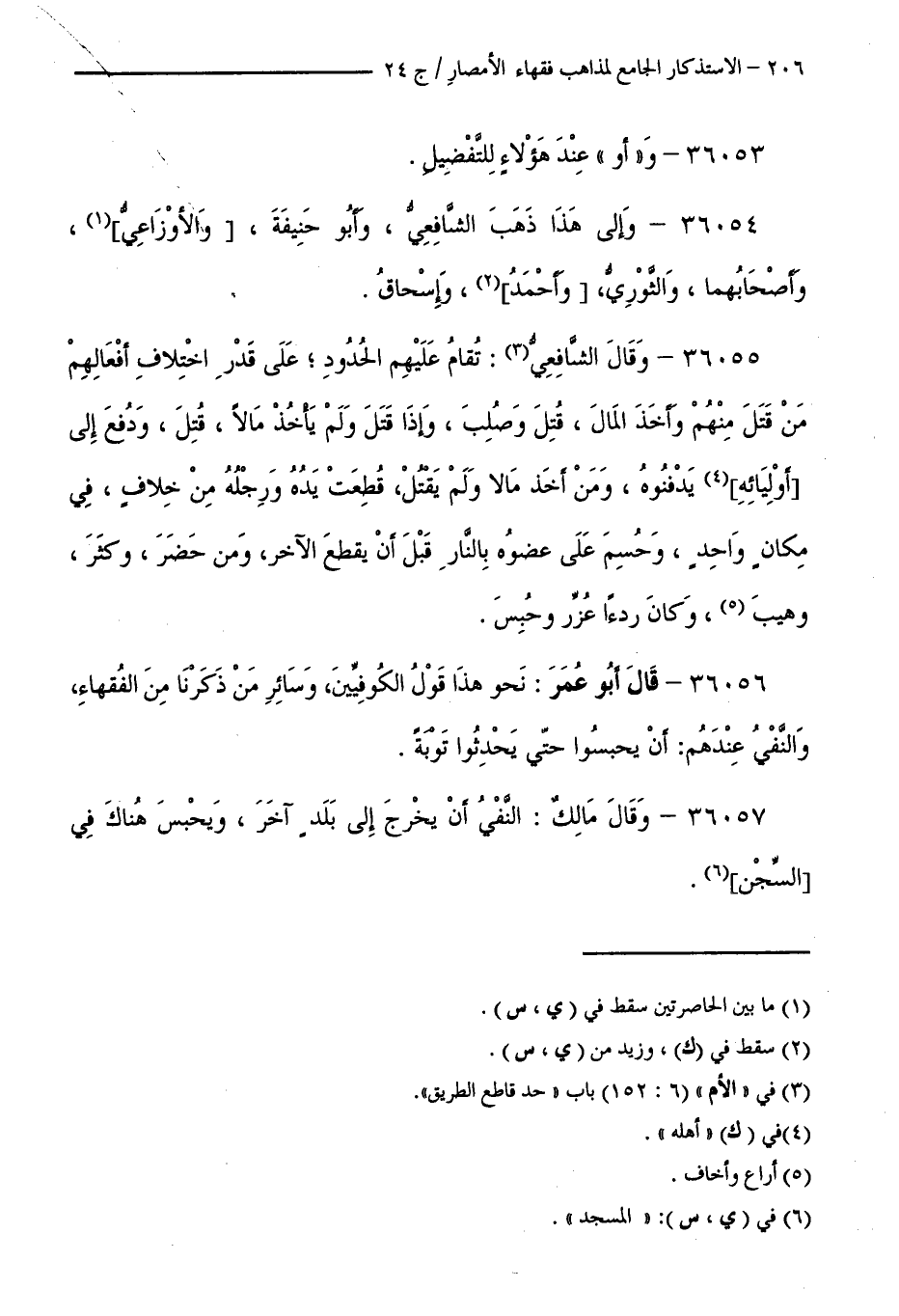 36055 - وَقَالَ الشَّافِعِيُّ: تُقَامُ عَلَيْهِمُ الْحُدُودُ ؛ عَلَى قَدْرِ اخْتِلَافِ أَفْعَالِهِمْ، مَنْ قَتَلَ مِنْهُمْ وَأَخَذَ الْمَالَ قُتِلَ وَصُلِبَ، وَإِذَا قَتَلَ وَلَمْ يَأْخُذْ مَالًا قُتِلَ، وَدُفِعَ إِلَى أَوْلِيَائِهِ يَدْفِنُونَهُ، وَمَنْ أَخَذَ مَالًا وَلَمْ يَقْتُلْ قُطِعَتْ يَدُهُ وَرِجْلُهُ مِنْ خِلَافٍ، فِي مَكَانٍ وَاحِدٍ، وَحُسِمَ عَلَى عُضْوِهِ بِالنَّارِ قَبْلَ أَنْ يُقْطَعَ الْآخَرُ، وَمَنْ حَضَرَ، وَكَثَرَ، وَهَيَّبَ، وَكَانَ رِدْءًا عُزِّرَ وَحُبِسَ.