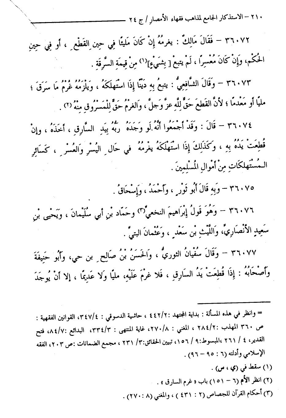 36077 - وَقَالَ سُفْيَانُ الثَّوْرِيُّ، وَالْحَسَنُ بْنُ صَالِحِ بْنِ حَيٍّ، وَأَبُو حَنِيفَةَ وَأَصْحَابُهُ: إِذَا قُطِعَتْ يَدُ السَّارِقِ فَلَا غُرْمَ عَلَيْهِ - مَلِيًّا وَلَا عَدِيمًا - إِلَّا أَنْ يُوجَدَ