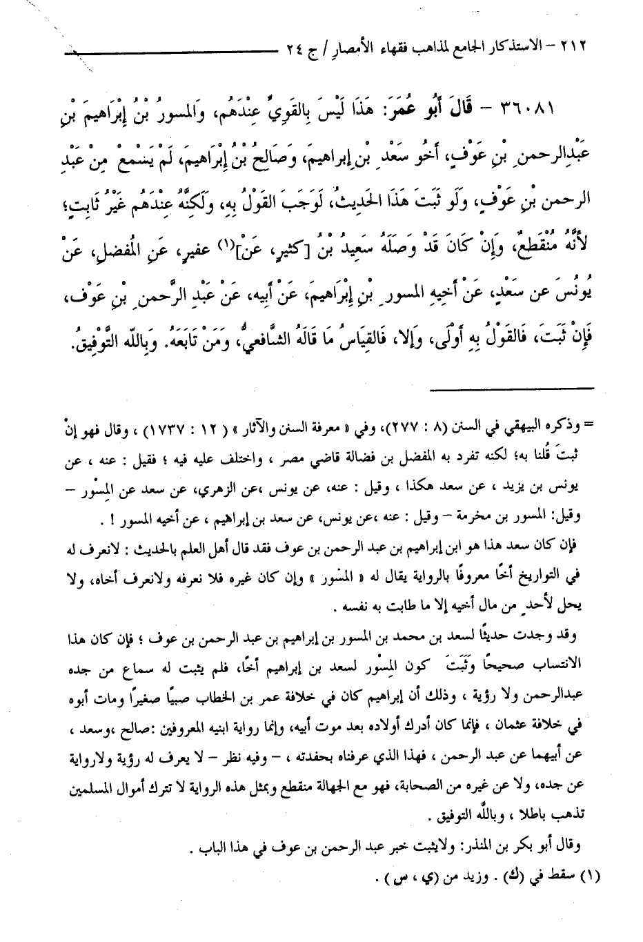 36081 - قَالَ أَبُو عُمَرَ: هَذَا لَيْسَ بِالْقَوِيِّ عِنْدَهُمْ، وَالْمِسْوَرُ بْنُ إِبْرَاهِيمَ بْنِ عَبْدِ الرَّحْمَنِ بْنِ عَوْفٍ أَخُو سَعْدِ بْنِ إِبْرَاهِيمَ، وَصَالِحُ بْنُ إِبْرَاهِيمَ لَمْ يَسْمَعْ مِنْ عَبْدِ الرَّحْمَنِ بْنِ عَوْفٍ، وَلَوْ ثَبَتَ هَذَا الْحَدِيثُ لَوَجَبَ الْقَوْلُ بِهِ، وَلَكِنَّهُ عِنْدَهُمْ غَيْرُ ثَابِتٍ ؛ لِأَنَّهُ مُنْقَطِعٌ، وَإِنْ كَانَ قَدْ وَصَلَهُ سَعِيدُ بْنُ كَثِيرٍ، عَنْ عُفَيْرٍ، عَنِ الْمُفَضَّلِ، عَنْ يُونُسَ عَنْ سَعْدٍ، عَنْ أَخِيهِ الْمِسْوَرِ بْنِ إِبْرَاهِيمَ، عَنْ أَبِيهِ عَنْ عَبْدِ الرَّحْمَنِ بْنِ عَوْفٍ، فَإِنْ ثَبَتَ فَالْقَوْلُ بِهِ أَوْلَى، وَإِلَّا فَالْقِيَاسُ مَا قَالَهُ الشَّافِعِيُّ، وَمَنْ تَابَعَهُ. وَبِاللَّهِ التَّوْفِيقُ.
