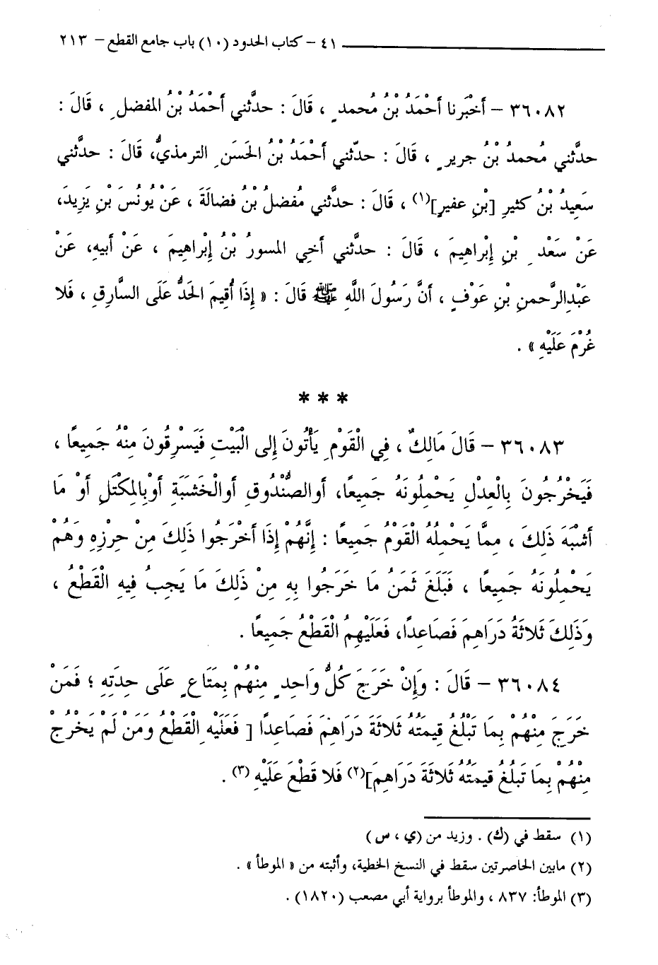 36083 - قَالَ مَالِكٌ فِي الْقَوْمِ يَأْتُونَ إِلَى الْبَيْتِ فَيَسْرِقُونَ مِنْهُ جَمِيعًا، فَيَخْرُجُونَ بِالْعِدْلِ يَحْمِلُونَهُ جَمِيعًا، أَوِ الصُّنْدُوقِ أَوِ الْخَشَبَةِ أَوْ بِالْمِكْتَلِ أَوْ مَا أَشْبَهَ ذَلِكَ، مِمَّا يَحْمِلُهُ الْقَوْمُ جَمِيعًا: إِنَّهُمْ إِذَا أَخْرَجُوا ذَلِكَ مِنْ حِرْزِهِ وَهُمْ يَحْمِلُونَهُ جَمِيعًا، فَبَلَغَ ثَمَنُ مَا خَرَجُوا بِهِ مِنْ ذَلِكَ مَا يَجِبُ فِيهِ الْقَطْعُ، وَذَلِكَ ثَلَاثَةُ دَرَاهِمَ فَصَاعِدًا، فَعَلَيْهِمُ الْقَطْعُ جَمِيعًا.
