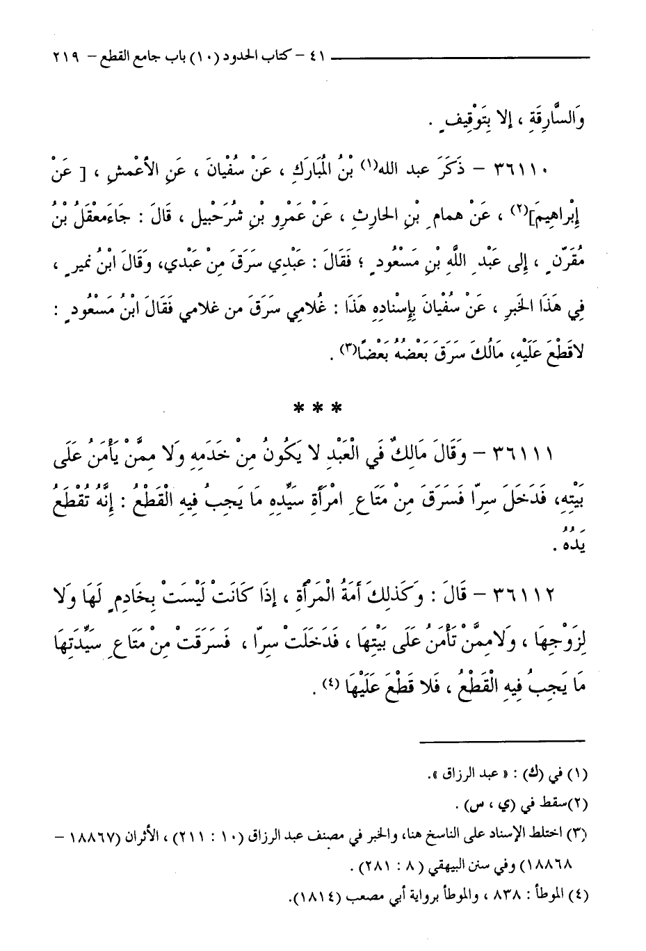 36110 - ذَكَرَ عَبْدُ اللَّهِ بْنُ الْمُبَارَكِ، عَنْ سُفْيَانَ، عَنِ الْأَعْمَشِ، عَنْ إِبْرَاهِيمَ، عَنْ هَمَّامِ بْنِ الْحَارِثِ، عَنْ عَمْرِو بْنِ شُرَحْبِيلٍ، قَالَ: جَاءَ مَعْقِلُ بْنُ مُقَرِّنٍ إِلَى عَبْدِ اللَّهِ بْنِ مَسْعُودٍ ؛ فَقَالَ: عَبْدِي سَرَقَ مِنْ عَبْدِي، وَقَالَ ابْنُ نُمَيْرٍ فِي هَذَا الْخَبَرِ، عَنْ سُفْيَانَ بِإِسْنَادِهِ هَذَا: غُلَامِي سَرَقَ مِنْ غُلَامِي. فَقَالَ ابْنُ مَسْعُودٍ: لَا قَطْعَ عَلَيْهِ، مَالُكَ سَرَقَ بَعْضُهُ بَعْضًا.