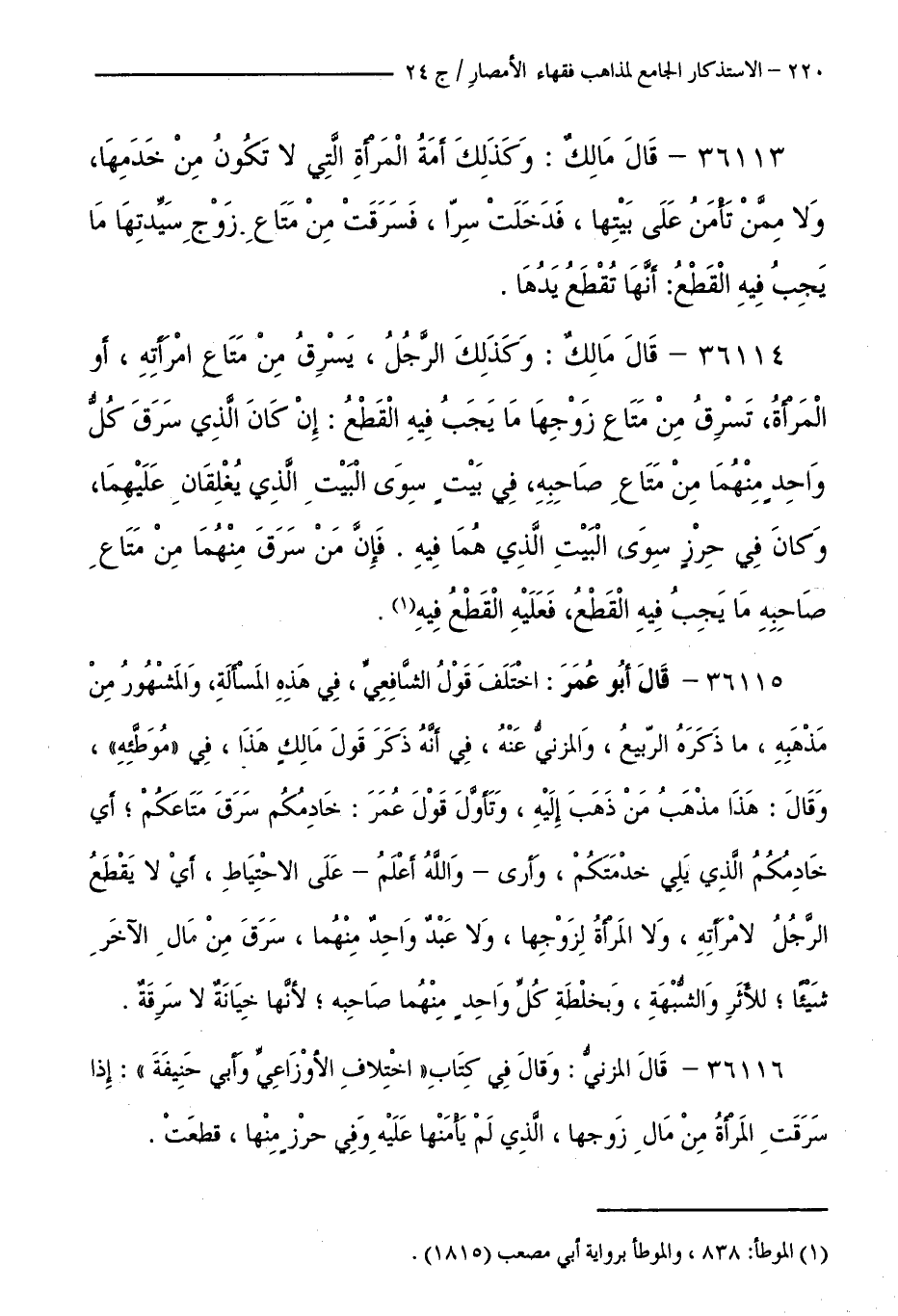 36114 - قَالَ مَالِكٌ: وَكَذَلِكَ الرَّجُلُ يَسْرِقُ مِنْ مَتَاعِ امْرَأَتِهِ، أَوِ الْمَرْأَةُ تَسْرِقُ مِنْ مَتَاعِ زَوْجِهَا مَا يَجِبُ فِيهِ الْقَطْعُ: إِنْ كَانَ الَّذِي سَرَقَ كُلُّ وَاحِدٍ مِنْهُمَا مِنْ مَتَاعِ صَاحِبِهِ، فِي بَيْتٍ سِوَى الْبَيْتِ الَّذِي يُغْلِقَانِ عَلَيْهِمَا، وَكَانَ فِي حِرْزٍ سِوَى الْبَيْتِ الَّذِي هُمَا فِيهِ. فَإِنَّ مَنْ سَرَقَ مِنْهُمَا مِنْ مَتَاعِ صَاحِبِهِ مَا يَجِبُ فِيهِ الْقَطْعُ، فَعَلَيْهِ الْقَطْعُ فِيهِ.