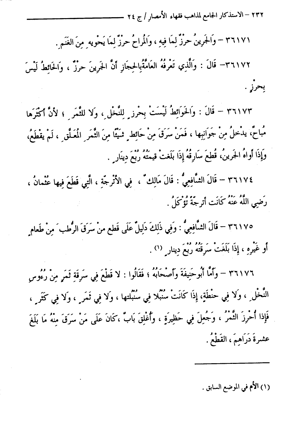 36172 - قَالَ: وَالَّذِي تَعْرِفُهُ الْعَامَّةُ بِالْحِجَازِ أَنَّ الْجَرِينَ حِرْزٌ، وَالْحَائِطَ لَيْسَ بِحِرْزٍ.