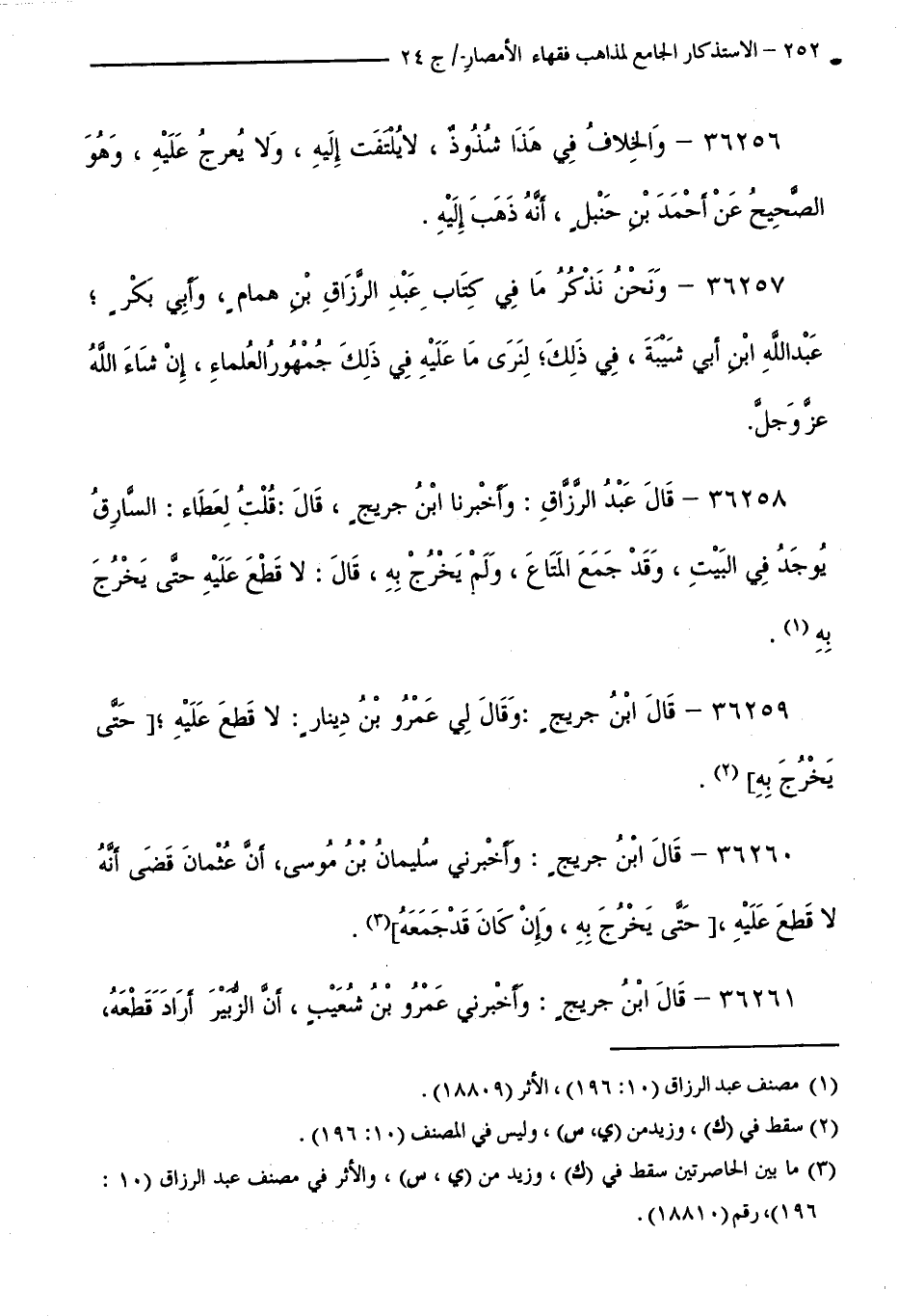 36260 - قَالَ ابْنُ جُرَيْجٍ: وَأَخْبَرَنِي سُلَيْمَانُ بْنُ مُوسَى أَنَّ عُثْمَانَ قَضَى أَنَّهُ لَا قَطْعَ عَلَيْهِ، حَتَّى يَخْرُجَ بِهِ، وَإِنْ كَانَ قَدْ جَمَعَهُ.