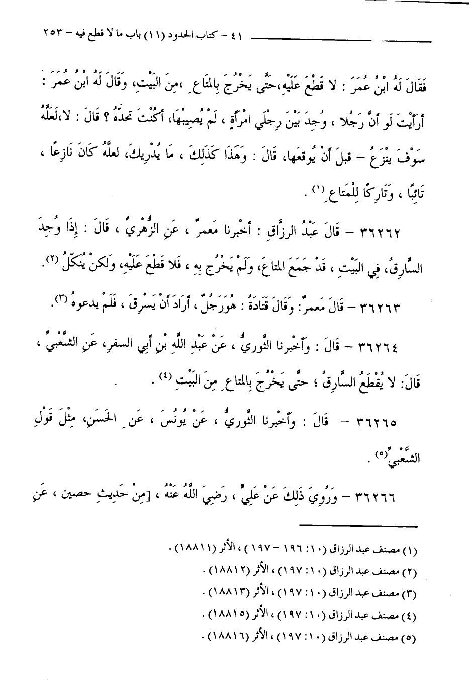 36264 - قَالَ: وَأَخْبَرَنَا الثَّوْرِيُّ، عَنْ عَبْدِ اللَّهِ بْنِ أَبِي السَّفَرِ، عَنِ الشَّعْبِيِّ، قَالَ: لَا يُقْطَعُ السَّارِقُ ؛ حَتَّى يَخْرُجَ بِالْمَتَاعِ مِنَ الْبَيْتِ.