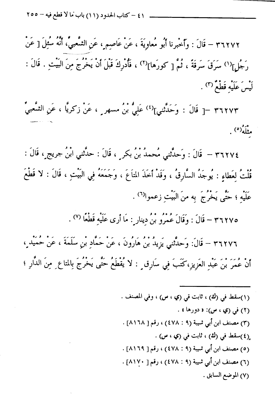 36276 قَالَ: وَحَدَّثَنِي يَزِيدُ بْنُ هَارُونَ، عَنْ حَمَّادِ بْنِ سَلَمَةَ، عَنْ حُمَيْدٍ، أَنَّ عُمَرَ بْنَ عَبْدِ الْعَزِيزِ كَتَبَ فِي سَارِقٍ: لَا يُقْطَعُ حَتَّى يَخْرُجَ بِالْمَتَاعِ مِنَ الدَّارِ ؛