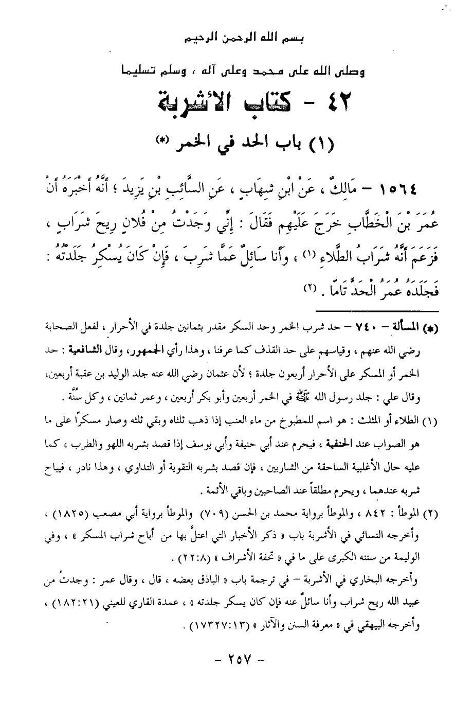 1564 - مَالِكٌ، عَنِ ابْنِ شِهَابٍ، عَنِ السَّائِبِ بْنِ يَزِيدَ ؛ أَنَّهُ أَخْبَرَهُ أَنَّ عُمَرَ بْنَ الْخَطَّابِ خَرَجَ عَلَيْهِمْ فَقَالَ: إِنِّي وَجَدْتُ مِنْ فُلَانٍ رِيحَ شَرَابٍ، فَزَعَمَ أَنَّهُ شَرَابُ الطِّلَاءِ، وَأَنَا سَائِلٌ عَمَّا شَرِبَ، فَإِنْ كَانَ يُسْكِرُ جَلَدْتُهُ: فَجَلَدَهُ عُمَرُ الْحَدَّ تَامًّا.