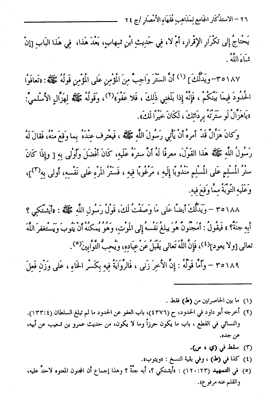 35187 - وَيَدُلُّكَ أَنَّ السَّتْرَ وَاجِبٌ مِنَ الْمُؤْمِنِ عَلَى الْمُؤْمِنِ قَوْلُهُ - صَلَّى اللَّهُ عَلَيْهِ وَسَلَّمَ -: "تَعَافَوُا الْحُدُودَ فِيمَا بَيْنَكُمْ، فَإِنَّهُ إِذَا بَلَغَنِي ذَلِكَ، فَلَا عَفْوَ "، وَقَوْلُهُ - صَلَّى اللَّهُ عَلَيْهِ وَسَلَّمَ - لِهَزَّالٍ الْأَسْلَمِيِّ: "يَا هَزَّالُ لَوْ سَتَرْتَهُ بِرِدَائِكَ، لَكَانَ خَيْرًا لَكَ ".