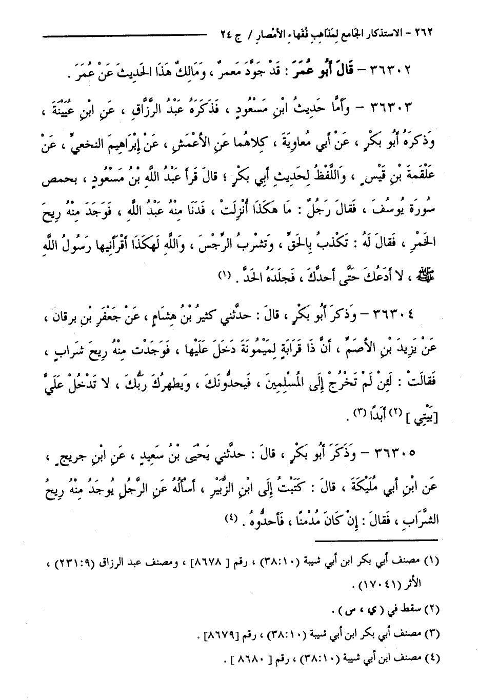 36303 - وَأَمَّا حَدِيثُ ابْنِ مَسْعُودٍ، فَذَكَرَهُ عَبْدُ الرَّزَّاقِ، عَنِ ابْنِ عُيَيْنَةَ، وَذَكَرَهُ أَبُو بَكْرٍ، عَنْ أَبِي مُعَاوِيَةَ، كِلَاهُمَا عَنِ الْأَعْمَشِ، عَنْ إِبْرَاهِيمَ النَّخَعِيِّ، عَنْ عَلْقَمَةَ بْنِ قَيْسٍ، وَاللَّفْظُ لِحَدِيثِ أَبِي بَكْرٍ ؛ قَالَ قَرَأَ عَبْدُ اللَّهِ بْنُ مَسْعُودٍ بِحِمْصَ سُورَةَ يُوسُفَ، فَقَالَ رَجُلٌ: مَا هَكَذَا أُنْزِلَتْ، فَدَنَا مِنْهُ عَبْدُ اللَّهِ فَوَجَدَ مِنْهُ رِيحَ الْخَمْرِ، فَقَالَ لَهُ: تُكَذِّبُ بِالْحَقِّ، وَتَشْرَبُ الرِّجْسَ، وَاللَّهِ لَهَكَذَا أَقْرَأَنِيهَا رَسُولُ اللَّهِ صَلَّى اللَّهُ عَلَيْهِ وَسَلَّمَ، لَا أَدَعُكَ حَتَّى أَحُدَّكَ، فَجَلَدَهُ الْحَدَّ.