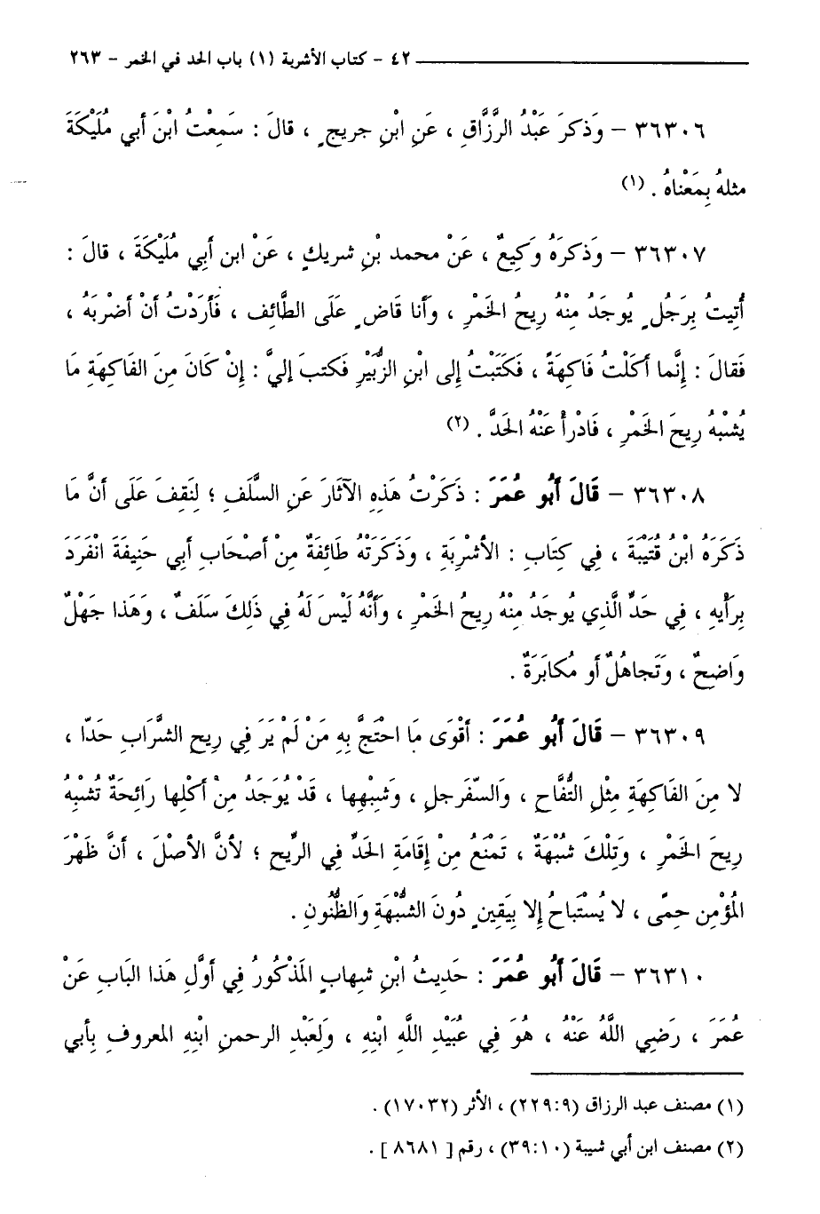 36308 - قَالَ أَبُو عُمَرَ: ذَكَرْتُ هَذِهِ الْآثَارَ عَنِ السَّلَفِ ؛ لِنَقِفَ عَلَى أَنَّ مَا ذَكَرَهُ ابْنُ قُتَيْبَةَ فِي كِتَابِ " الْأَشْرِبَةِ "، وَذَكَرَتْهُ طَائِفَةٌ مِنْ أَصْحَابِ أَبِي حَنِيفَةَ، انْفَرَدَ بِرَأْيِهِ فِي حَدِّ الَّذِي يُوجَدُ مِنْهُ رِيحُ الْخَمْرِ، وَأَنَّهُ لَيْسَ لَهُ فِي ذَلِكَ سَلَفٌ، وَهَذَا جَهْلٌ وَاضِحٌ، وَتَجَاهُلٌ أَوْ مُكَابَرَةٌ.