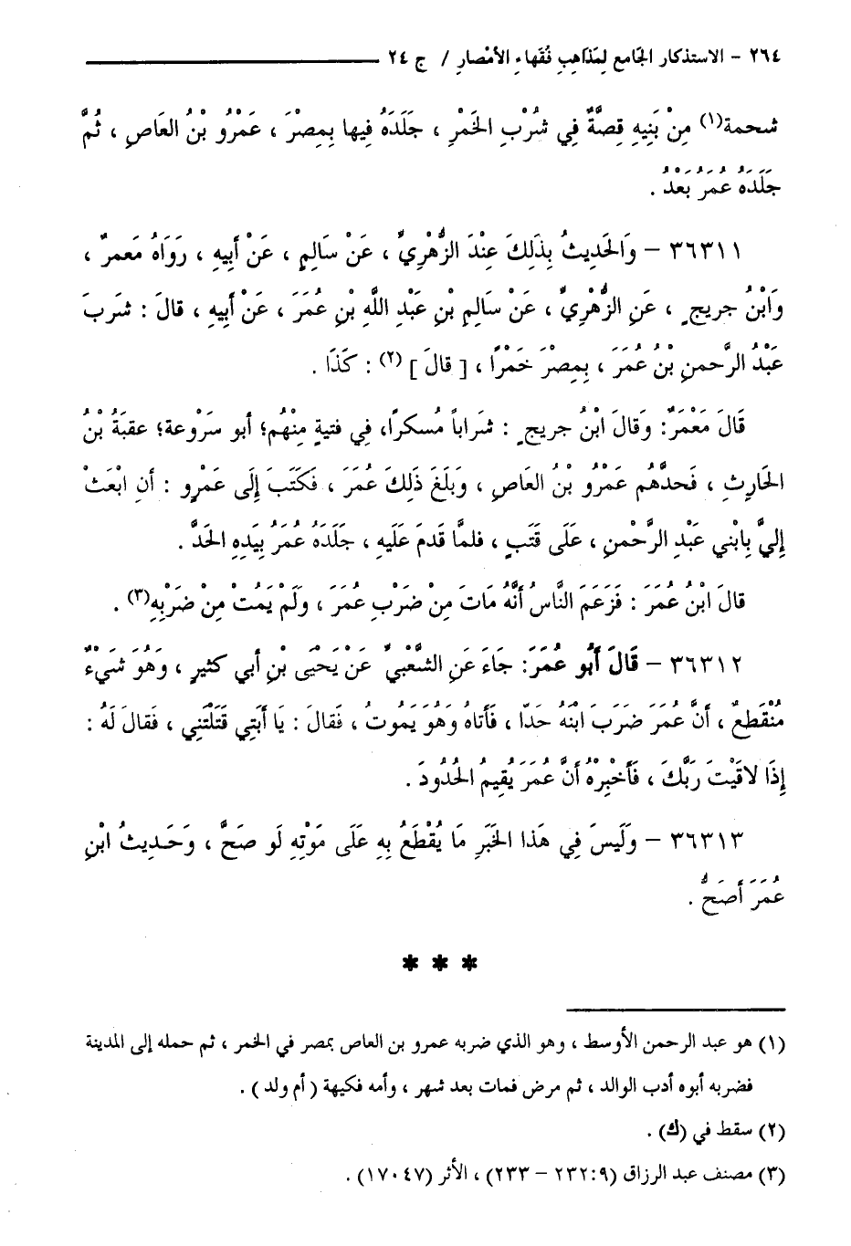 36311 - وَالْحَدِيثُ بِذَلِكَ عِنْدَ الزُّهْرِيِّ، عَنْ سَالِمٍ، عَنْ أَبِيهِ، رَوَاهُ مَعْمَرٌ، وَابْنُ جُرَيْجٍ، عَنِ الزُّهْرِيِّ، عَنْ سَالِمِ بْنِ عَبْدِ اللَّهِ بْنِ عُمَرَ، عَنْ أَبِيهِ، قَالَ: شَرِبَ عَبْدُ الرَّحْمَنِ بْنُ عُمَرَ بِمِصْرَ خَمْرًا - قَالَ: كَذَا قَالَ مَعْمَرٌ، وَقَالَ ابْنُ جُرَيْجٍ: شَرَابًا مُسْكِرًا - فِي فِتْيَةٍ مِنْهُمْ أَبُو سَرْوَعَةَ عُقْبَةُ بْنُ الْحَارِثِ، فَحَدَّهُمْ عَمْرُو بْنُ الْعَاصِ، وَبَلَغَ ذَلِكَ عُمَرَ، فَكَتَبَ إِلَى عَمْرٍو: أَنِ ابْعَثْ إِلَيَّ بِابْنِي عَبْدِ الرَّحْمَنِ عَلَى قَتَبٍ، فَلَمَّا قَدِمَ عَلَيْهِ جَلَدَهُ عُمَرُ بِيَدِهِ الْحَدَّ.