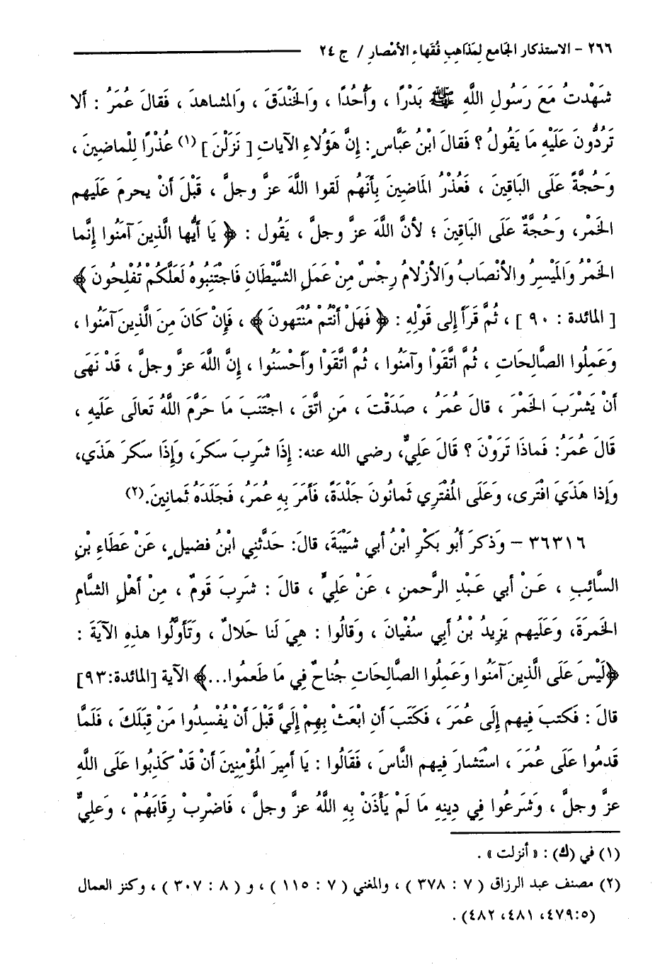 شَهِدْتُ مَعَ رَسُولِ اللَّهِ صَلَّى اللَّهُ عَلَيْهِ وَسَلَّمَ بَدْرًا، وَأُحُدًا، وَالْخَنْدَقَ، وَالْمَشَاهِدَ، فَقَالَ عُمَرُ: أَلَا تَرُدُّونَ عَلَيْهِ مَا يَقُولُ ؟ فَقَالَ ابْنُ عَبَّاسٍ: إِنَّ هَؤُلَاءِ الْآيَاتِ نَزَلْنَ عُذْرًا لِلْمَاضِينَ، وَحُجَّةً عَلَى الْبَاقِينَ، فَعَذَرَ الْمَاضِينَ بِأَنَّهُمْ لَقُوا اللَّهَ عَزَّ وَجَلَّ قَبْلَ أَنْ يُحَرِّمَ عَلَيْهِمُ الْخَمْرَ، وَحُجَّةً عَلَى الْبَاقِينَ ؛ لِأَنَّ اللَّهَ عَزَّ وَجَلَّ يَقُولُ: (يَاأَيُّهَا الَّذِينَ آمَنُوا إِنَّمَا الْخَمْرُ وَالْمَيْسِرُ وَالْأَنْصَابُ وَالْأَزْلَامُ رِجْسٌ مِنْ عَمَلِ الشَّيْطَانِ فَاجْتَنِبُوهُ لَعَلَّكُمْ تُفْلِحُونَ ) [ الْمَائِدَةِ: 90 ]، ثُمَّ قَرَأَ إِلَى قَوْلِهِ (فَهَلْ أَنْتُمْ مُنْتَهُونَ )، فَإِنْ كَانَ مِنَ الَّذِينَ آمَنُوا وَعَمِلُوا الصَّالِحَاتِ، ثُمَّ اتَّقَوْا وَآمَنُوا، ثُمَّ اتَّقَوْا وَأَحْسَنُوا، إِنَّ اللَّهَ - عَزَّ وَجَلَّ - قَدْ نَهَى أَنْ يُشْرَبُ الْخَمْرُ. قَالَ عُمَرُ: صَدَقْتَ، مَنِ اتَّقَى اجْتَنَبَ مَا حَرَّمَ اللَّهُ تَعَالَى عَلَيْهِ، قَالَ عُمَرُ: فَمَاذَا تَرَوْنَ ؟ قَالَ عَلِيٌّ رَضِيَ اللَّهُ عَنْهُ: إِذَا شَرِبَ سَكِرَ، وَإِذَا سَكِرَ هَذَى، وَإِذَا هَذَى افْتَرَى، وَعَلَى الْمُفْتَرِي ثَمَانُونَ جَلْدَةً، فَأَمَرَ بِهِ عَمَرُ فَجَلَدَهُ ثَمَانِينَ.
