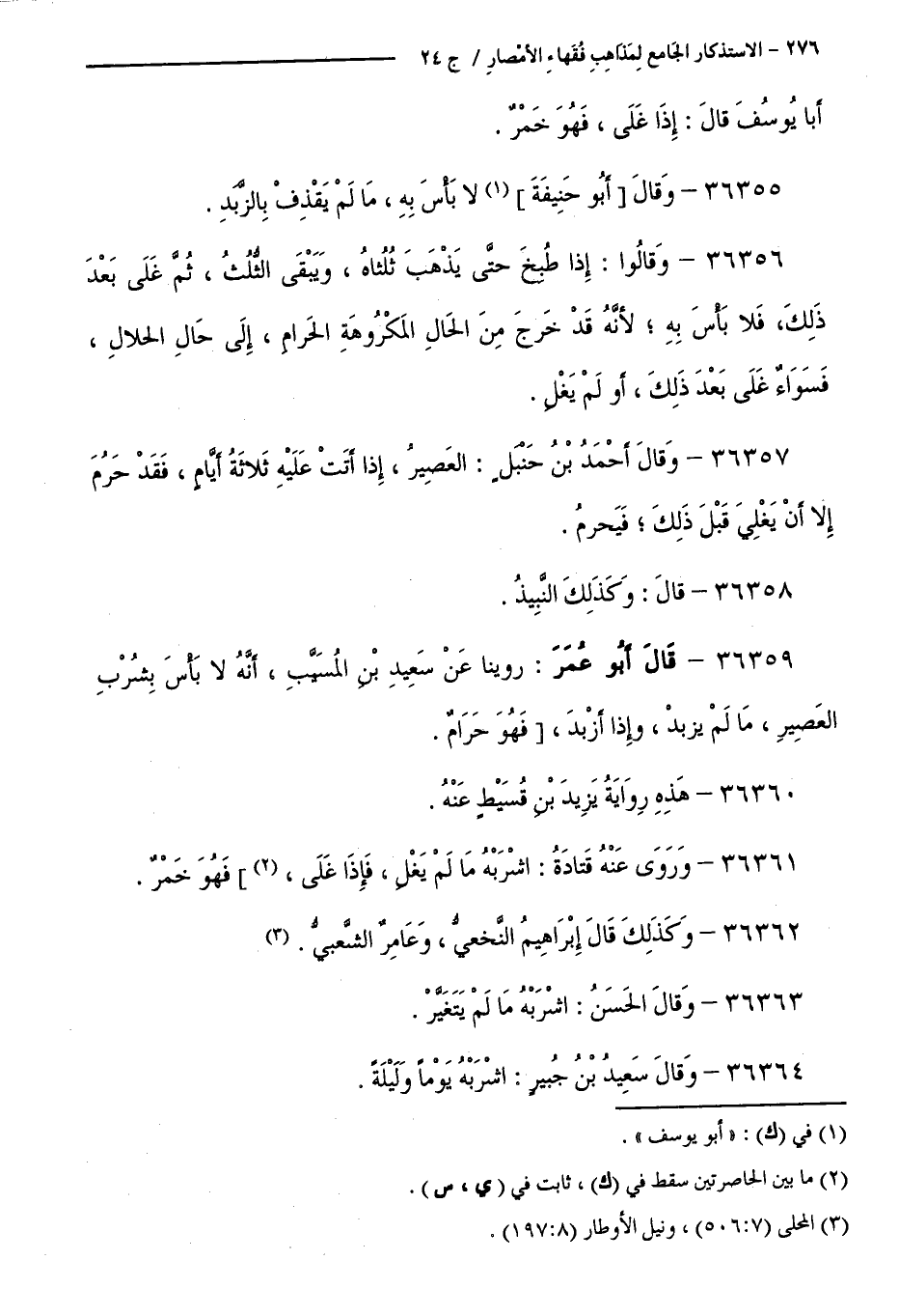 36359 - قَالَ أَبُو عُمَرَ: رُوِّينَا عَنْ سَعِيدِ بْنِ الْمُسَيَّبِ، أَنَّهُ لَا بَأْسَ بِشُرْبِ الْعَصِيرِ مَا لَمْ يُزْبِدْ، وَإِذَا أَزْبَدَ فَهُوَ حَرَامٌ.