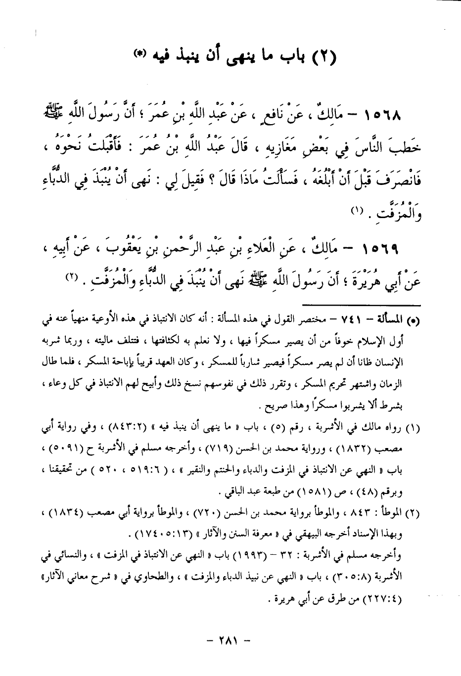 1568 - مَالِكٌ، عَنْ نَافِعٍ، عَنْ عَبْدِ اللَّهِ بْنِ عُمَرَ ؛أَنَّ رَسُولَ اللَّهِ صَلَّى اللَّهُ عَلَيْهِ وَسَلَّمَ خَطَبَ النَّاسَ فِي بَعْضِ مَغَازِيهِ، قَالَ عَبْدُ اللَّهِ بْنُ عُمَرَ: فَأَقْبَلْتُ نَحْوَهُ فَانْصَرَفَ قَبْلَ أَنْ أَبْلُغَهُ، فَسَأَلْتُ مَاذَا قَالَ ؟ فَقِيلَ لِي: نَهَى أَنْ يَنْبِذَ فِي الدُّبَّاءِ وَالْمُزَفَّتِ.
