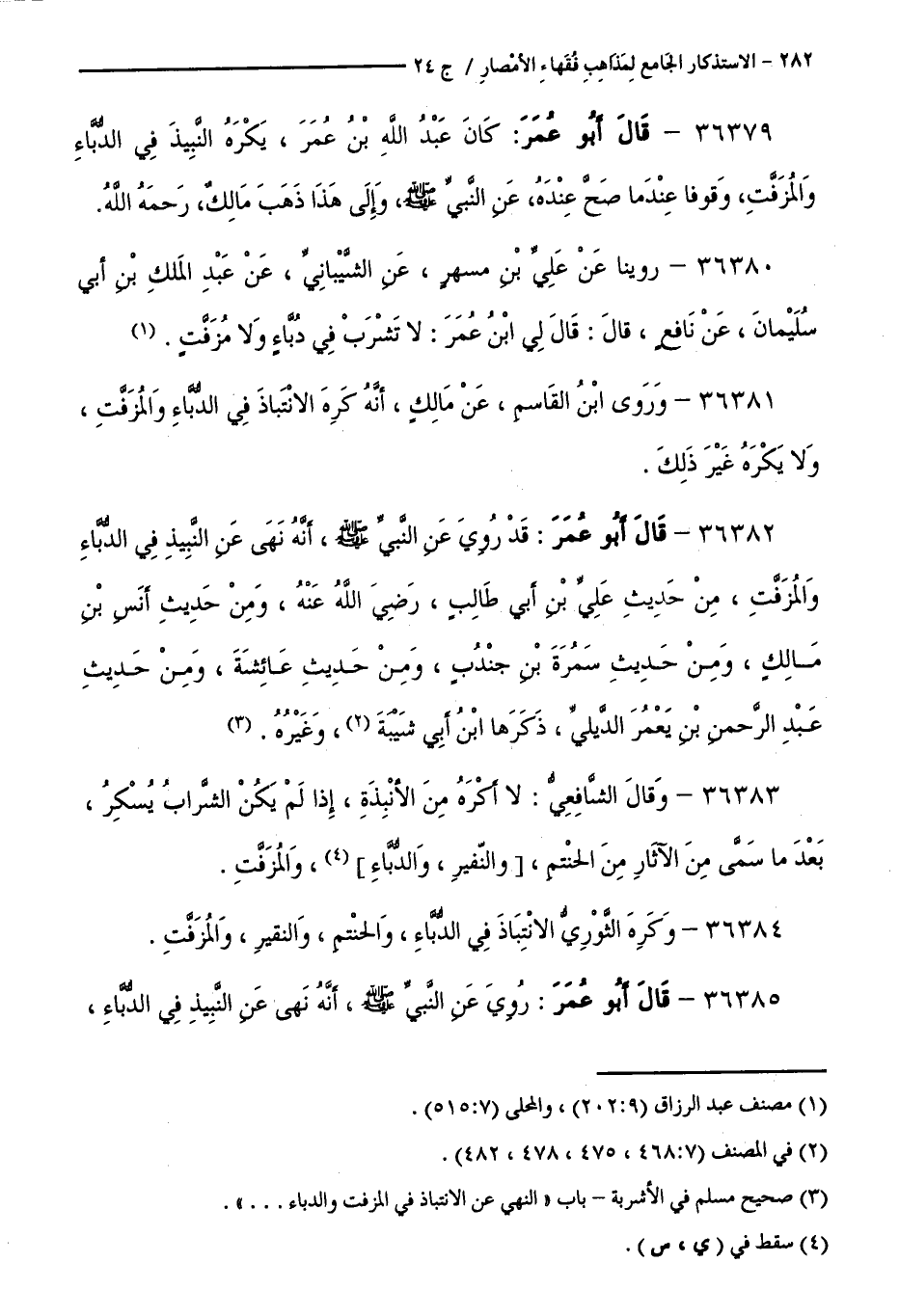 36385 - قَالَ أَبُو عُمَرَ: رُوِيَعَنِ النَّبِيِّ صَلَّى اللَّهُ عَلَيْهِ وَسَلَّمَ أَنَّهُ نَهَى عَنِ النَّبِيذِ فِي الدُّبَّاءِ،