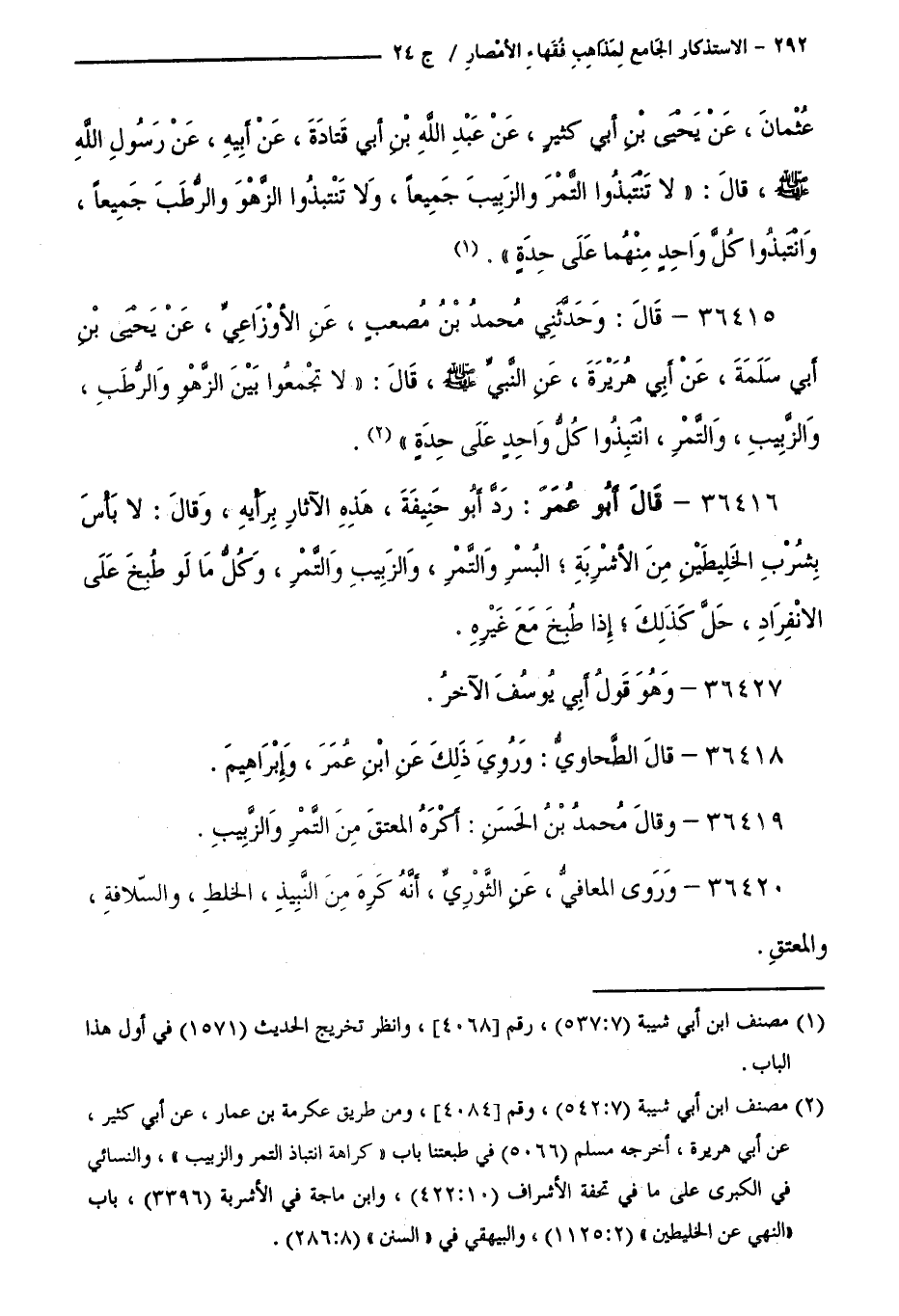 36416 - قَالَ أَبُو عُمَرَ: رَدَّ أَبُو حَنِيفَةَ هَذِهِ الْآثَارَ بِرَأْيِهِ، وَقَالَ: لَا بَأْسَ بِشُرْبِ الْخَلِيطَيْنِ مِنَ الْأَشْرِبَةِ ؛ الْبُسْرِ وَالتَّمْرِ، وَالزَّبِيبِ وَالتَّمْرِ، وَكُلِّ مَا لَوْ طُبِخَ عَلَى الِانْفِرَادِ حَلَّ، كَذَلِكَ إِذَا طُبِخَ مَعَ غَيْرِهِ.