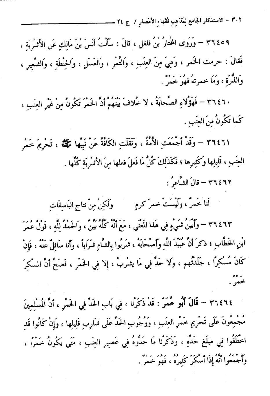 36464 - قَالَ أَبُو عُمَرَ: قَدْ ذَكَرْنَا " فِي بَابِ الْحَدِّ فِي الْخَمْرِ " أَنَّ الْمُسْلِمِينَ مُجْمِعُونَ عَلَى تَحْرِيمِ خَمْرِ الْعِنَبِ، وَوُجُوبِ الْحَدِّ عَنْ شَارِبِ قَلِيلِهَا، وَإِنْ كَانُوا قَدِ اخْتَلَفُوا فِي مَبْلَغِ حَدِّهِ، وَذَكَرْنَا مَا حَدُّوهُ فِي عَصِيرِ الْعِنَبِ، مَتَى يَكُونُ خَمْرًا، وَأَجْمَعُوا أَنَّهُ إِذَا أَسْكَرَ كَثِيرُهُ فَهُوَ خَمْرٌ.