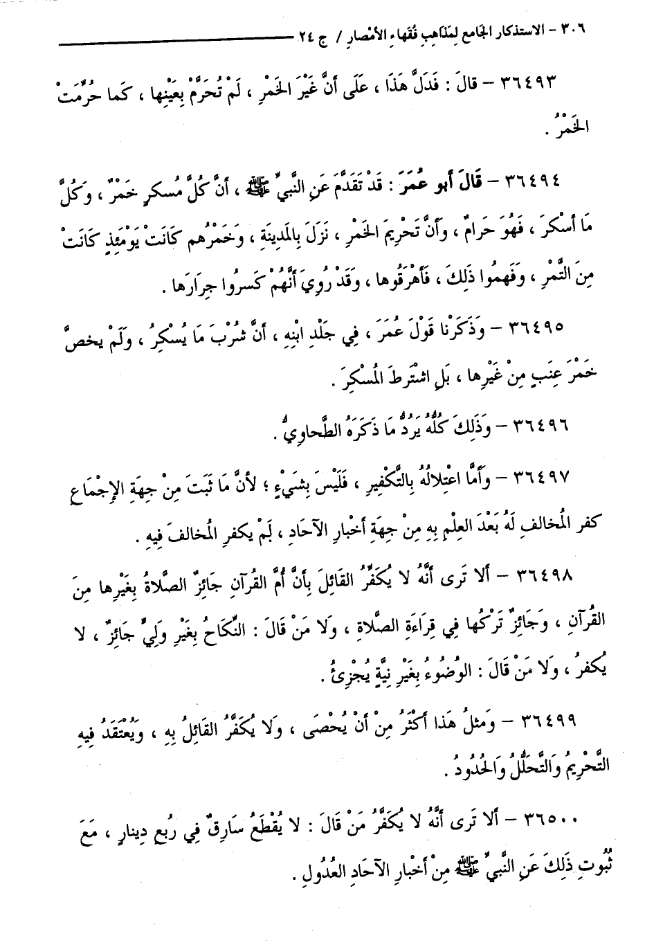 36498 - أَلَا تَرَى أَنَّهُ لَا يُكَفَّرُ الْقَائِلُ بِأَنَّ أُمَّ الْقُرْآنِ جَائِزٌ الصَّلَاةُ بِغَيْرِهَا مِنَ الْقُرْآنِ، وَجَائِزٌ تَرْكُهَا فِي قِرَاءَةِ الصَّلَاةِ، وَلَا مَنْ قَالَ: النِّكَاحُ بِغَيْرِ وَلِيٍّ جَائِزٌ، لَا يُكَفَّرُ، وَلَا مَنْ قَالَ: الْوُضُوءُ بِغَيْرِ نِيَّةٍ يُجْزِئُ.