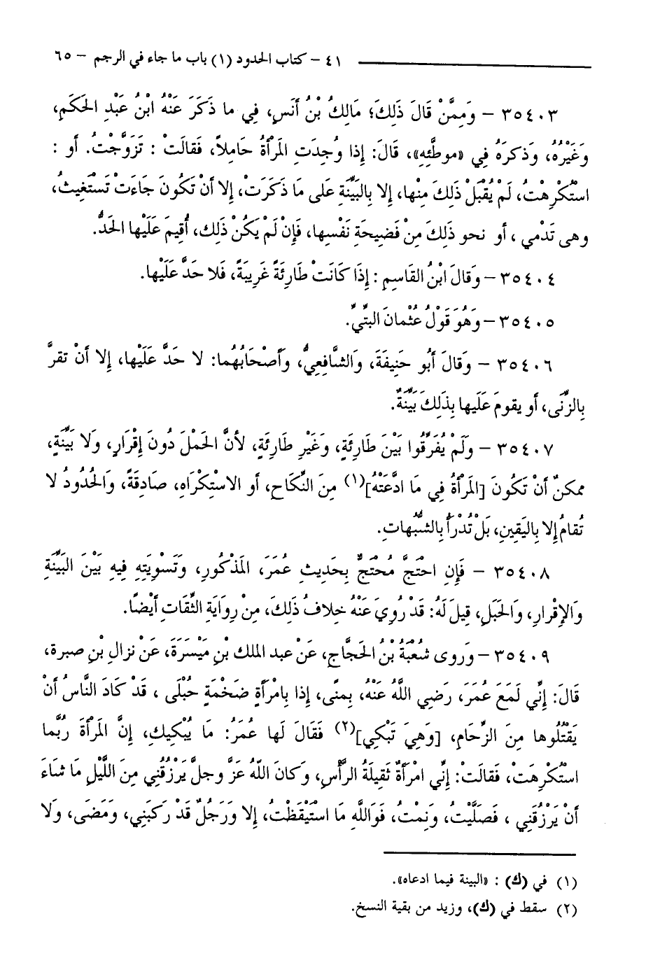 35403 - وَمِمَّنْ قَالَ ذَلِكَ ؛ مَالِكُ بْنُ أَنَسٍ، فِيمَا ذَكَرَ عَنْهُ ابْنُ عَبْدِ الْحَكَمِ، وَغَيْرُهُ، وَذَكَرَهُ فِي " مُوَطَّئِهِ " قَالَ: إِذَا وُجِدَتِ الْمَرْأَةُ حَامِلًا، فَقَالَتْ: تَزَوَّجْتُ. أَوِ اسْتُكْرِهْتُ، لَمْ يُقْبَلْ ذَلِكَ مِنْهَا، إِلَّا بِالْبَيِّنَةِ عَلَى مَا ذَكَرْتُ، إِلَّا أَنْ تَكُونَ جَاءَتْ تَسْتَغِيثُ، وَهِيَ تَدْمَى، أَوْ نَحْوُ ذَلِكَ مِنْ فَضِيحَةِ نَفْسِهَا، فَإِنْ لَمْ يَكُنْ ذَلِكَ، أُقِيمَ عَلَيْهَا الْحَدُّ.