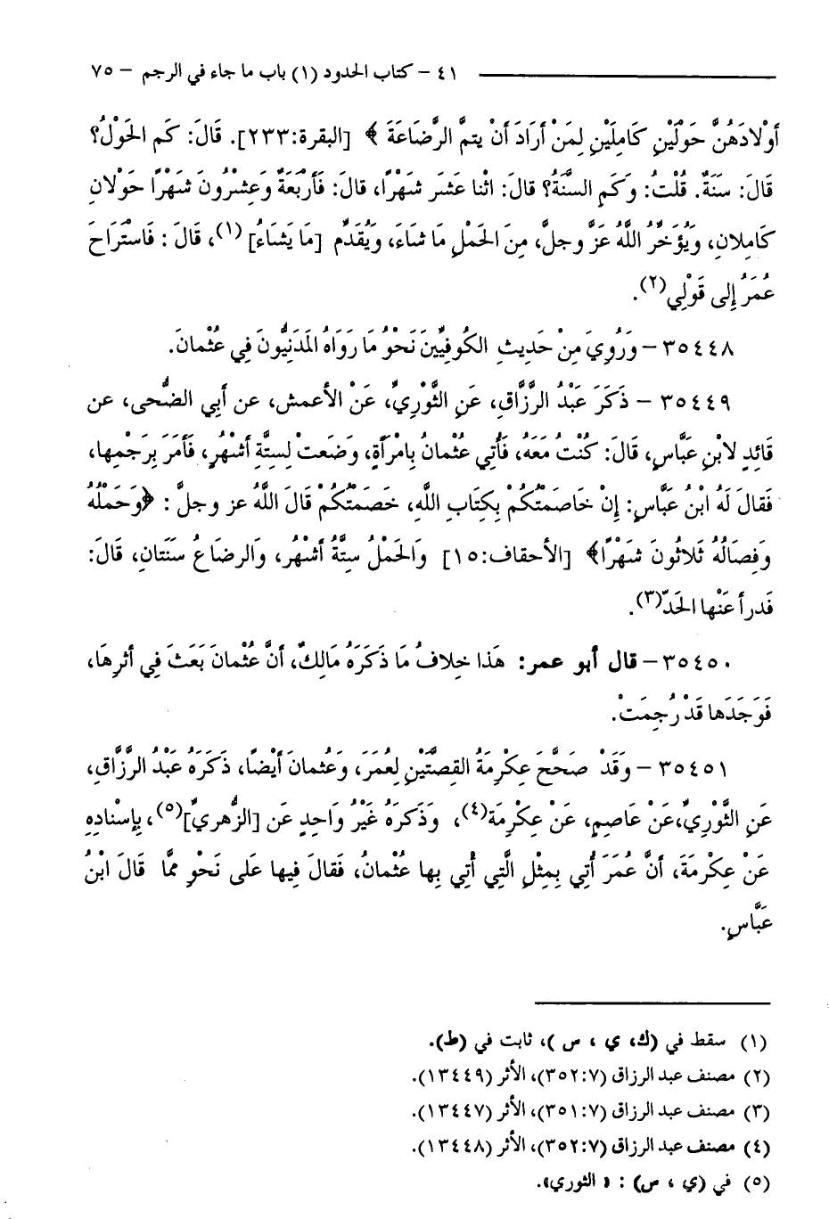 35449 - ذَكَرَ عَبْدُ الرَّزَّاقِ، عَنِ الثَّوْرِيِّ، عَنِ الْأَعْمَشِ، عَنْ أَبِي الضُّحَى، عَنْ قَائِدٍ لِابْنِ عَبَّاسٍ، قَالَ: كُنْتُ مَعَهُ، فَأُتِيَ عُثْمَانُ بِامْرَأَةٍ وَضَعَتْ لِسِتَّةِ أَشْهُرٍ، فَأَمَرَ بِرَجْمِهَا، فَقَالَ لَهُ ابْنُ عَبَّاسٍ: إِنْ خَاصَمْتُكُمْ بِكِتَابِ اللَّهِ، خَصَمْتُكُمْ ؛ قَالَ اللَّهُ عَزَّ وَجَلَّ: (وَحَمْلُهُ وَفِصَالُهُ ثَلَاثُونَ شَهْرًا ) [ الْأَحْقَافِ: 15 ] وَالْحَمْلُ سِتَّةُ أَشْهُرٍ، وَالرَّضَاعُ سَنَتَانِ، قَالَ: فَدَرَأَ عَنْهَا الْحَدَّ.