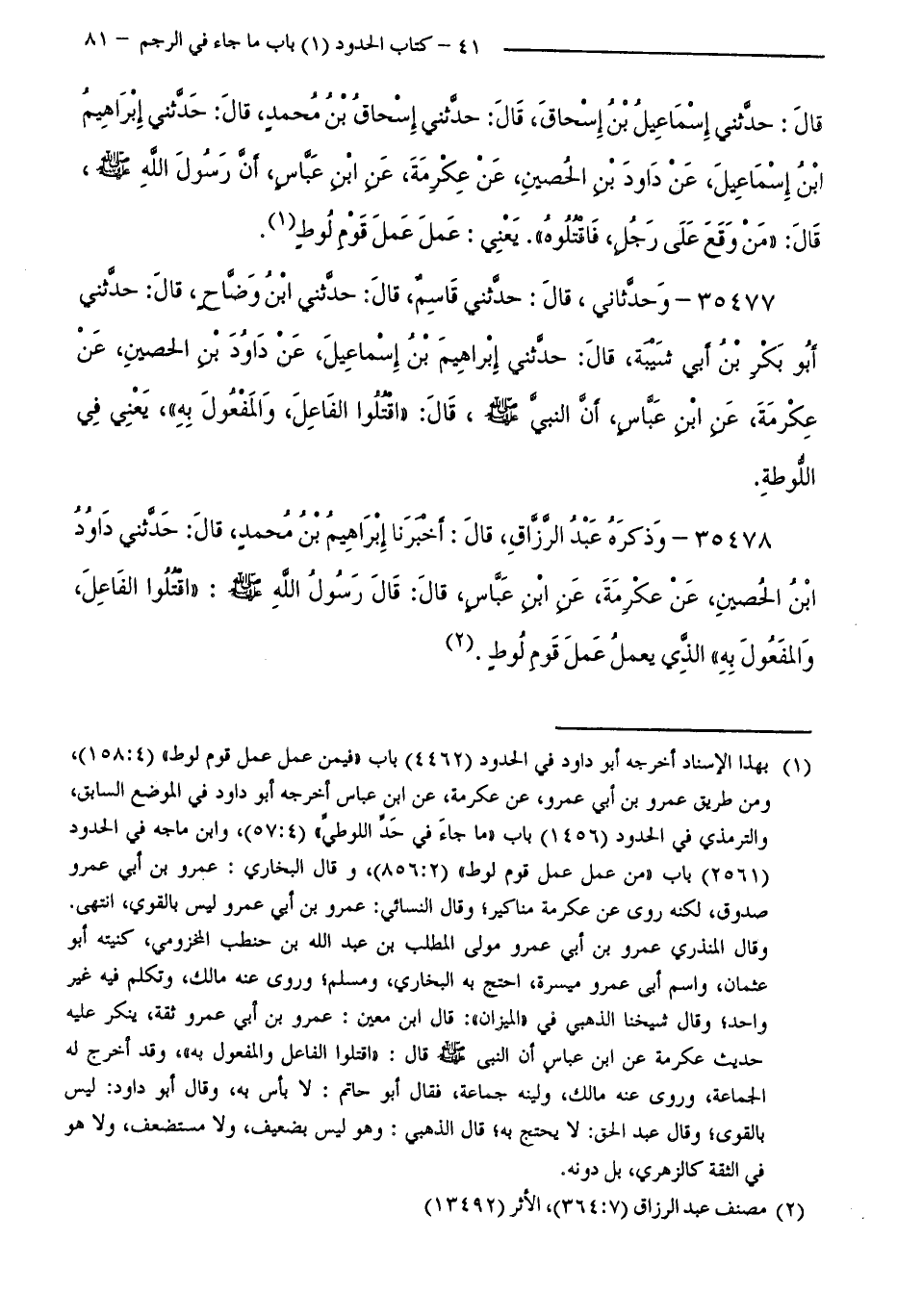 35478 - وَذَكَرَهُ عَبْدُ الرَّزَّاقِ، قَالَ: أَخْبَرَنَا إِبْرَاهِيمُ بْنُ مُحَمَّدٍ، قَالَ: حَدَّثَنِي دَاوُدُ بْنُ الْحُصَيْنِ، عَنْ عِكْرِمَةَ، عَنِ ابْنِ عَبَّاسٍ، قَالَ: قَالَ رَسُولُ اللَّهِ صَلَّى اللَّهُ عَلَيْهِ وَسَلَّمَ: "اقْتُلُوا الْفَاعِلَ، وَالْمَفْعُولَ بِهِ " الَّذِي يَعْمَلُ عَمَلَ قَوْمِ لُوطٍ.