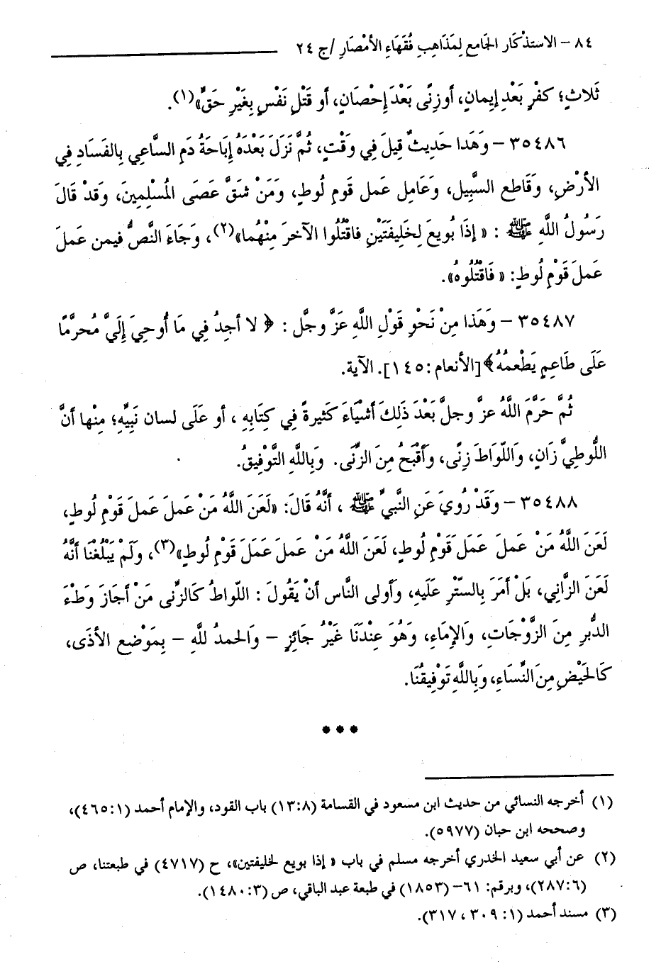 35488 - وَقَدْ رُوِيَ عَنِ النَّبِيِّ صَلَّى اللَّهُ عَلَيْهِ وَسَلَّمَ، أَنَّهُ قَالَ: "لَعَنَ اللَّهُ مَنْ عَمِلَ عَمَلَ قَوْمِ لُوطٍ، لَعَنَ اللَّهُ مَنْ عَمِلَ عَمَلَ قَوْمِ لُوطٍ، لَعَنَ اللَّهُ مَنْ عَمِلَ عَمَلَ قَوْمِ لُوطٍ "، وَلَمْ يَبْلُغْنَا أَنَّهُ لَعَنَ الزَّانِيَ، بَلْ أَمَرَ بِالسَّتْرِ عَلَيْهِ، وَأَوْلَى النَّاسِ أَنْ يَقُولَ: اللِّوَاطُ كَالزِّنَا مَنْ أَجَازَ وَطْءَ الدُّبُرِ مِنَ الزَّوْجَاتِ، وَالْإِمَاءِ، وَهُوَ عِنْدُنَا غَيْرُ جَائِزٍ - وَالْحَمْدُ لِلَّهِ - بِمَوْضِعِ الْأَذَى، كَالْحَيْضِ مِنَ النِّسَاءِ، وَبِاللَّهِ تَوْفِيقُنَا.