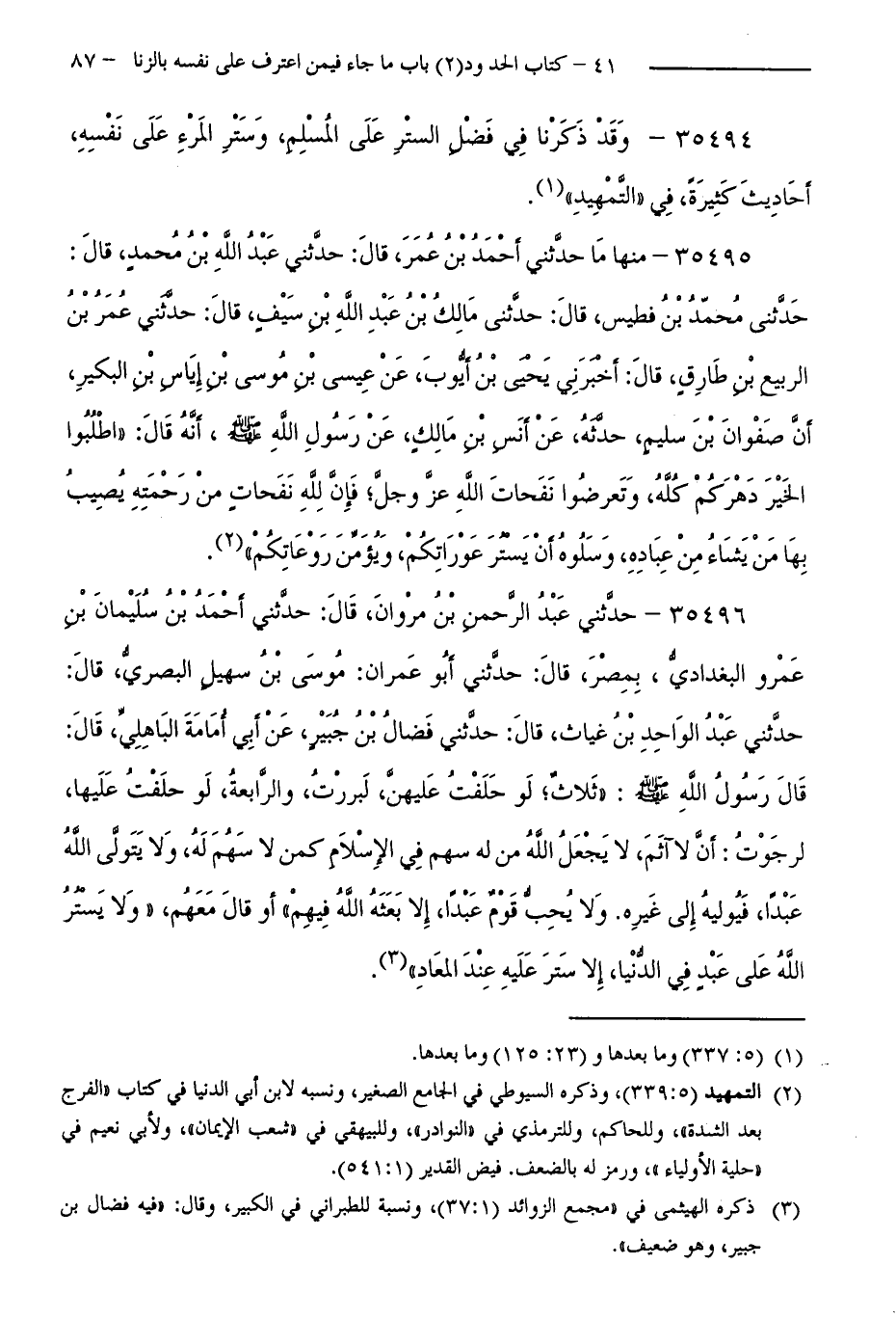 35494 - وَقَدْ ذَكَرْنَا فِي فَضْلِ السَّتْرِ عَلَى الْمُسْلِمِ، وَسَتْرِ الْمَرْءِ عَلَى نَفْسِهِ، أَحَادِيثَ كَثِيرَةً فِي " التَّمْهِيدِ ".