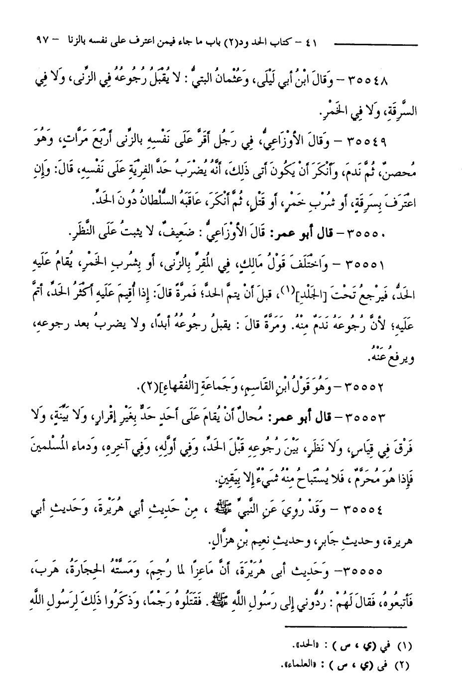 35548 - وَقَالَ ابْنُ أَبِي لَيْلَى، وَعُثْمَانُ الْبَتِّيُّ: لَا يُقْبَلُ رُجُوعُهُ فِي الزِّنَا، وَلَا فِي السَّرِقَةِ، وَلَا فِي الْخَمْرِ.