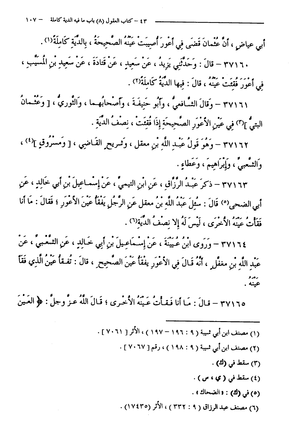37163 - ذَكَرَ عَبْدُ الرَّزَّاقِ، عَنِ ابْنِ التَّيْمِيِّ، عَنْ إِسْمَاعِيلَ بْنِ أَبِي خَالِدٍ، عَنْ أَبِي الضُّحَى قَالَ: سُئِلَ عَبْدُ اللَّهِ بْنُ مَعْقِلٍ عَنِ الرَّجُلِ يَفْقَأُ عَيْنَ الْأَعْوَرِ ; فَقَالَ: مَا أَنَا فَقَأْتُ عَيْنَهُ الْأُخْرَى، لَيْسَ لَهُ إِلَّا نِصْفُ الدِّيَةِ.